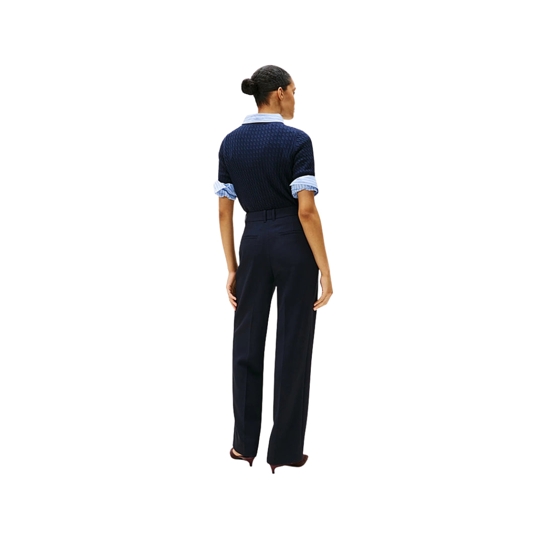 Pantaloni in misto viscosa stretch, leggeri e dal taglio dritto slim fit. Dotati di zip e chiusura nascosta con gancio, pieghe stirate e due tasche a filetto sul retro. Rifiniti con branding Tommy Hilfiger e bandierina in metallo sul retro per un tocco distintivo