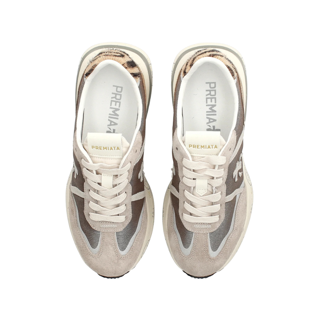 Questi modelli si fanno notare per il tallone animalier: la versione in nero con dettagli zebrati dona grinta e contrasto a ogni outfit, mentre quella in tonalità beige e tortora con inserto tigrato aggiunge un tocco più caldo ma altrettanto audace. Entrambe sono realizzate in un mix di suede e nylon tecnico con finiture premium, pensate per offrire comfort e leggerezza senza rinunciare allo stile.