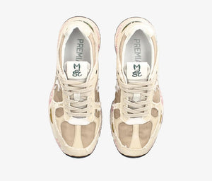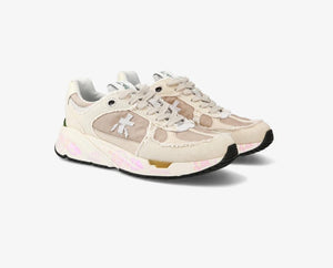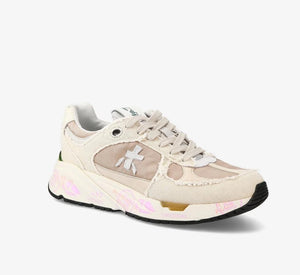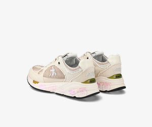 inserti in tessuto e pelle. La punta è caratterizzata dall'utilizzo di materiale tecnico ripstop, il talloncino è in pelle a contrato di colore. La linguetta in nylon è impreziosita dal label in pelle Mased stilizzato a contrasto di colore. Tutti questi dettagli e inserti a contrasto rappresentano in particolar modo questo modello. La suola ergonomica e super leggera riporta il lettering iconico di Premiata.