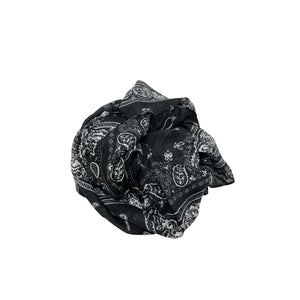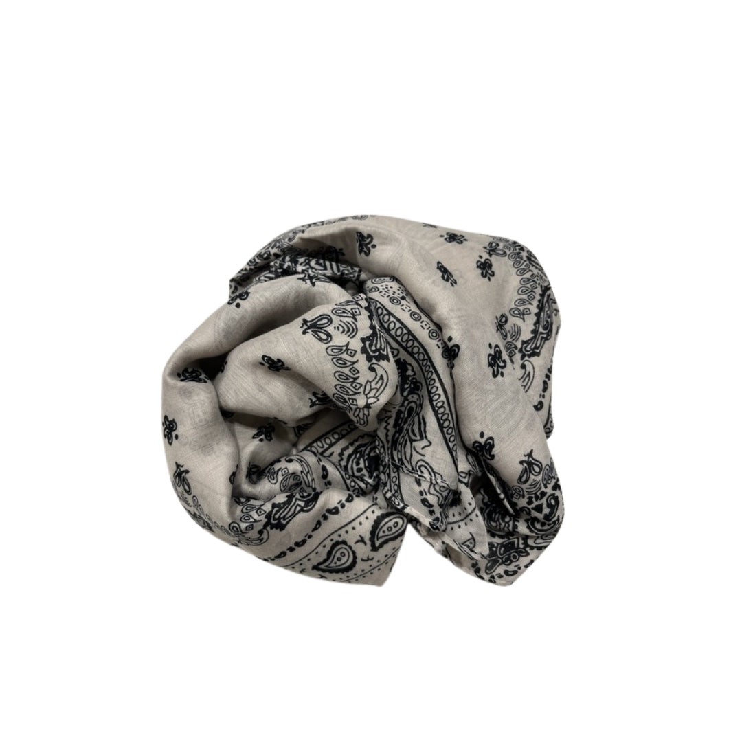 Foulard Namasté con sfondo nero e bianco. Caratterizzato da una lucentezza naturale e una texture morbida. Questo accessorio aggiunge un tocco di eleganza a qualsiasi outfit.