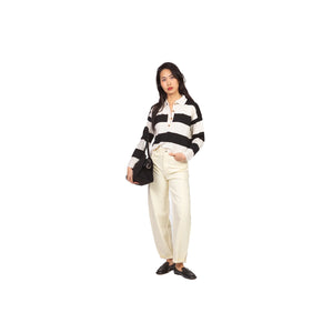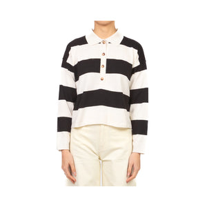 Maglia polo a manica lunga con chiusura a bottoncini e motivo rigato. Vestibilità leggermente cropped e linea dritta, tessuto morbido e confortevole, perfetta per un look casual e moderno.
