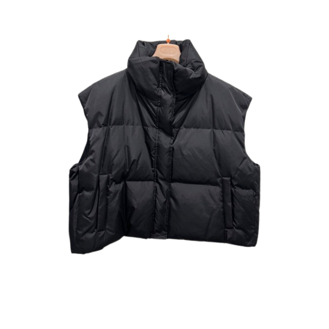 Gilet oversized imbottito in tessuto tecnico. Chiusura frontale con zip in metallo e bottoni a pressione. Tasche laterali alla francese. Collo alto.