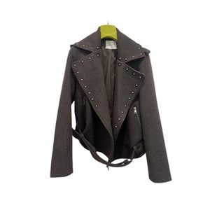 È una giacca corta stile biker in lana grigio scuro, con borchie metalliche lungo i revers e le spalle. Ha chiusura asimmetrica con zip, cintura in vita e un look grintoso ma elegante.
