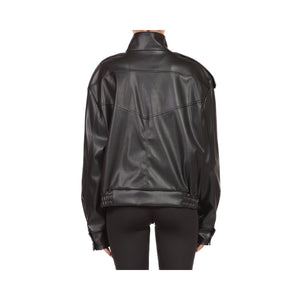 Bomber in ecopelle con chiusura principale a lampo e collo alto. Modello con doppia chiusura asimmetrica con bottoni a clip, tasche laterali e fondo con elastico. Linea strutturata, vestibilità regolare e finiture tecniche.