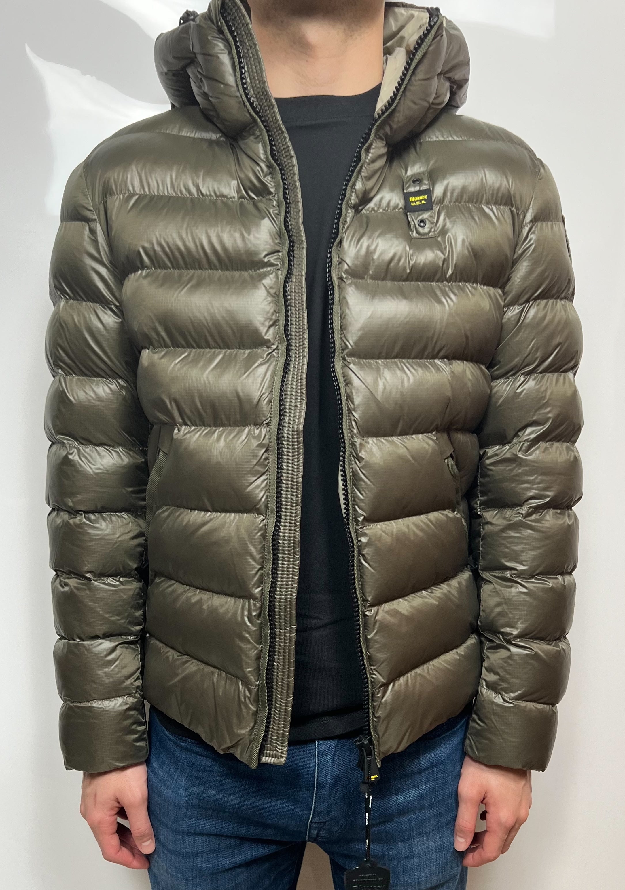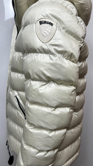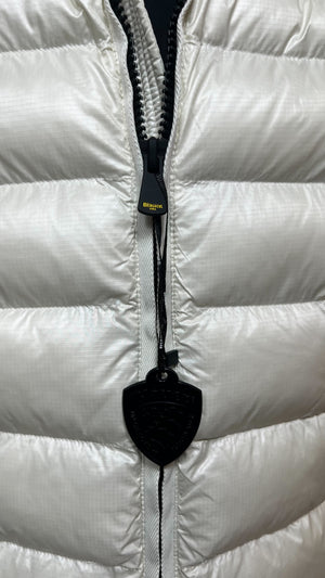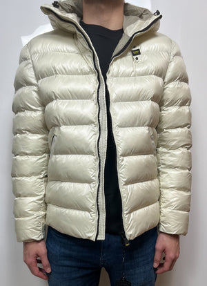 Giubbino BLAUER bianco trapuntato a righe orizzontali singole e doppie intervallate. Capo iconico Blauer con imbottitura naturale in piuma, calda e non ingombrante.