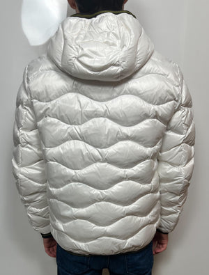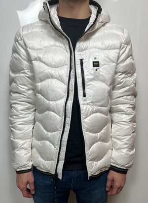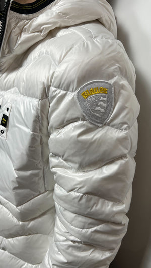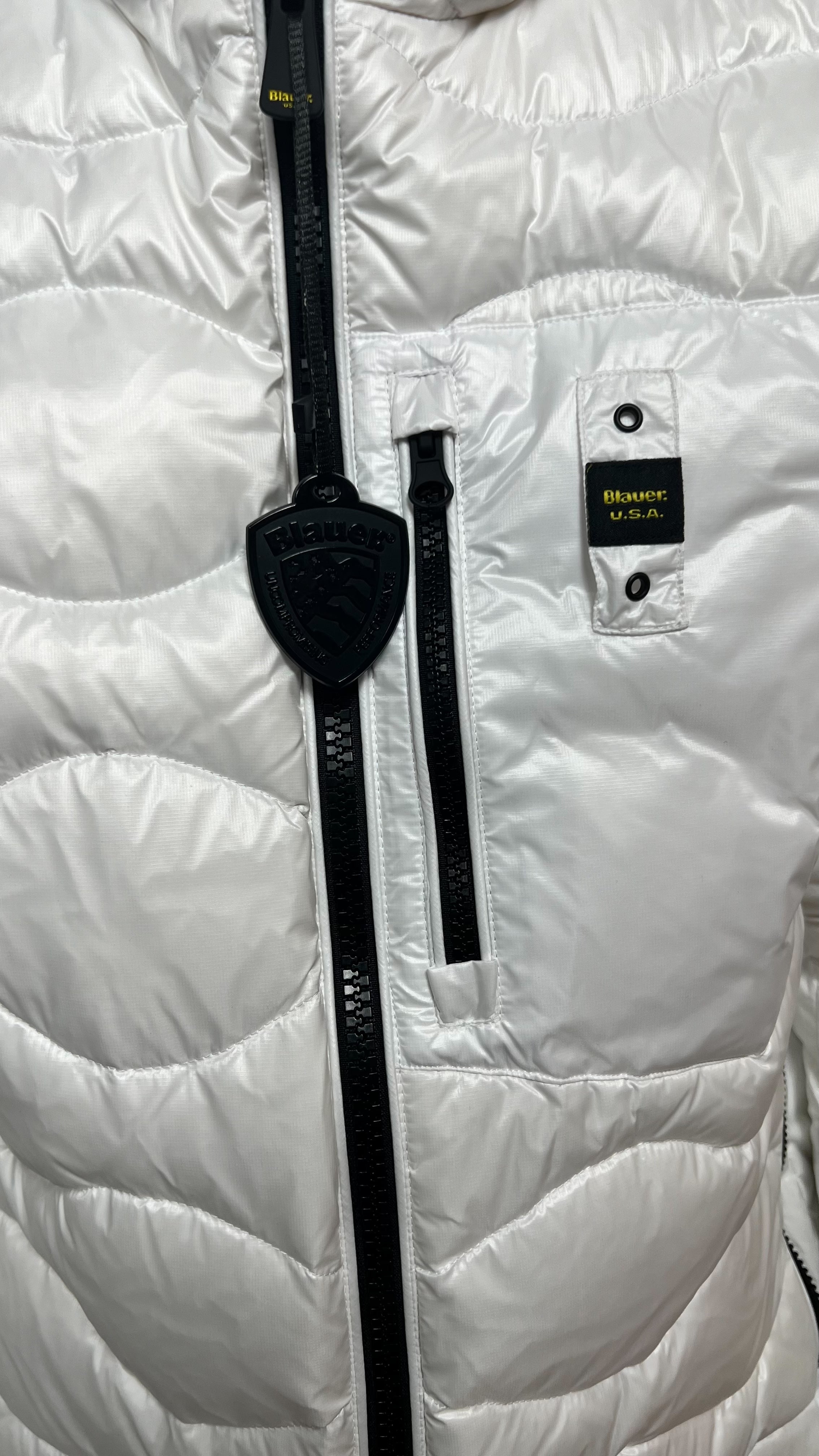 Giubbino BLAUER bianco taglio bomber trapuntato ad onde orizzontali. Taschina applicata sul petto a sinistra per donare al capo iconico Blauer un tocco più comodo e funzionale. Imbottitura naturale in piuma, calda e non ingombrante.