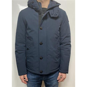 Giubbino BLAUER blu idrorepellente in neoprene e foderata internamente in nylon con impuntura ad onde orizzontali. Cappuccio fisso con coulisse, realizzato in neoprene liscio. Foderato in nylon micro rip in tono con leggero motivo check. Imbottito ovatta Sorona® Aura.