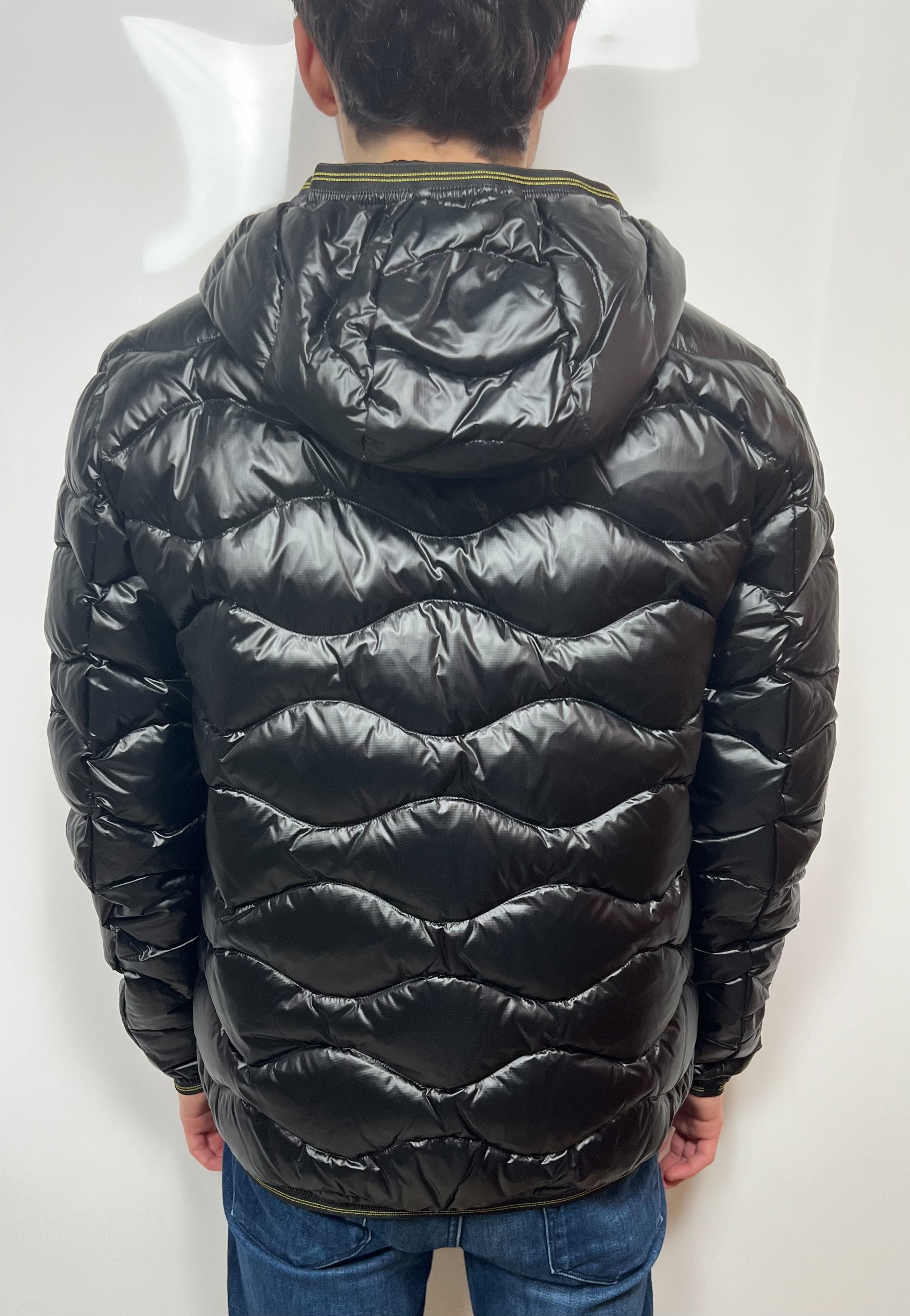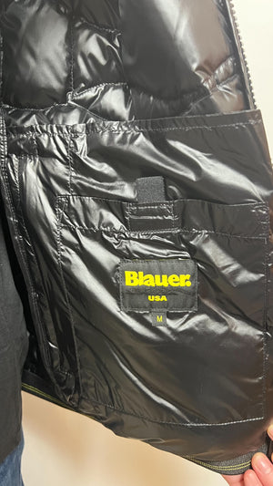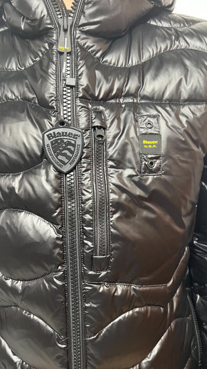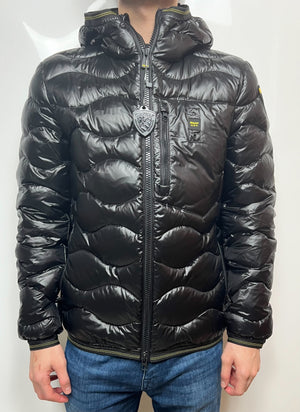 Giubbino BLAUER nero taglio bomber trapuntato ad onde orizzontali. Taschina applicata sul petto a sinistra per donare al capo iconico Blauer un tocco più comodo e funzionale. Imbottitura naturale in piuma, calda e non ingombrante.