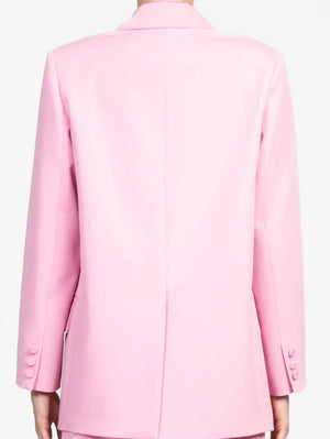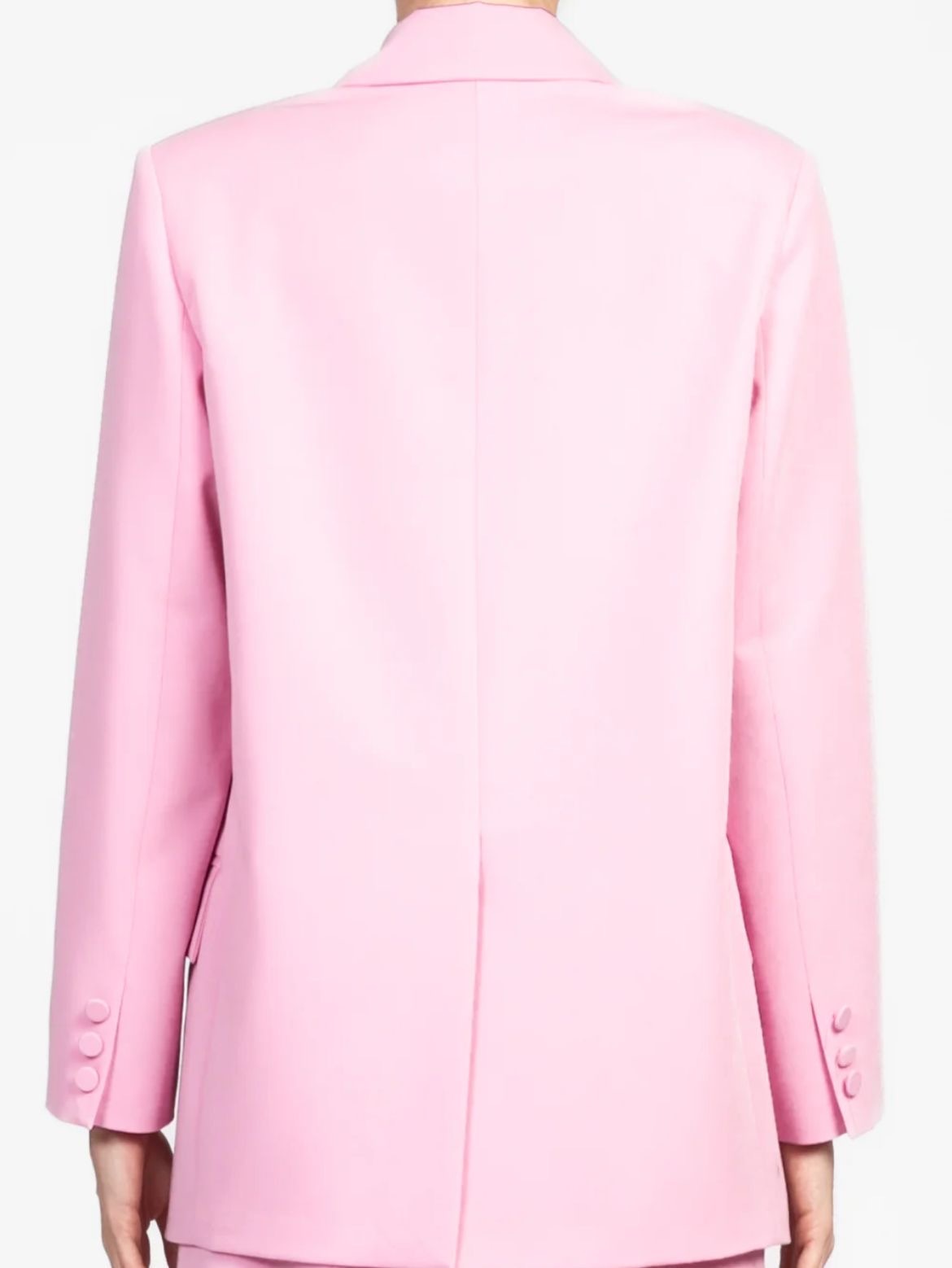 Blazer con collo a revers e maniche lunghe con bottoni sul polso. Tasche frontali a pattina. Chiusura doppiopetto con bottoni ricoperti. Spacco posteriore e Spalle Over.