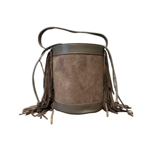 Questa borsa secchiello unisce stile e praticità con un tocco distintivo. Il design strutturato viene arricchito da una superficie effetto scamosciato e frange laterali che donano movimento e personalità. Il manico rigido permette un comodo trasporto a mano, mentre l'interno è protetto da una chiusura a coulisse in tessuto, perfetta per custodire con discrezione i tuoi effetti personali.