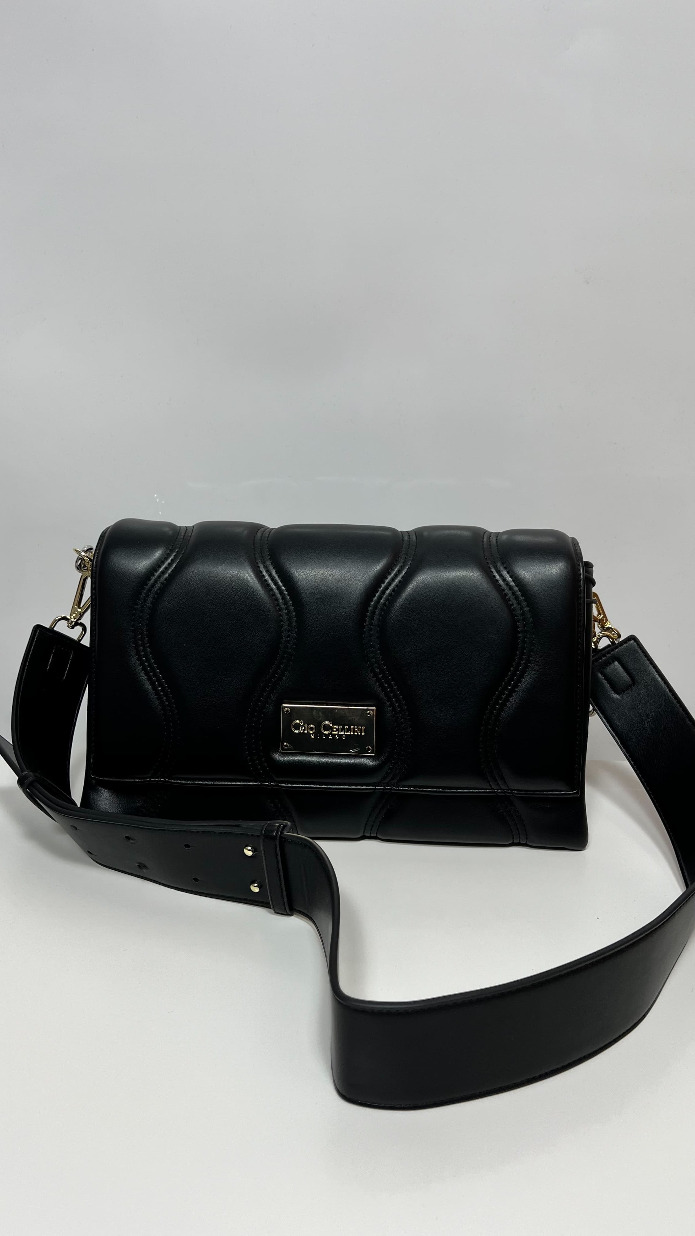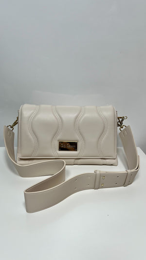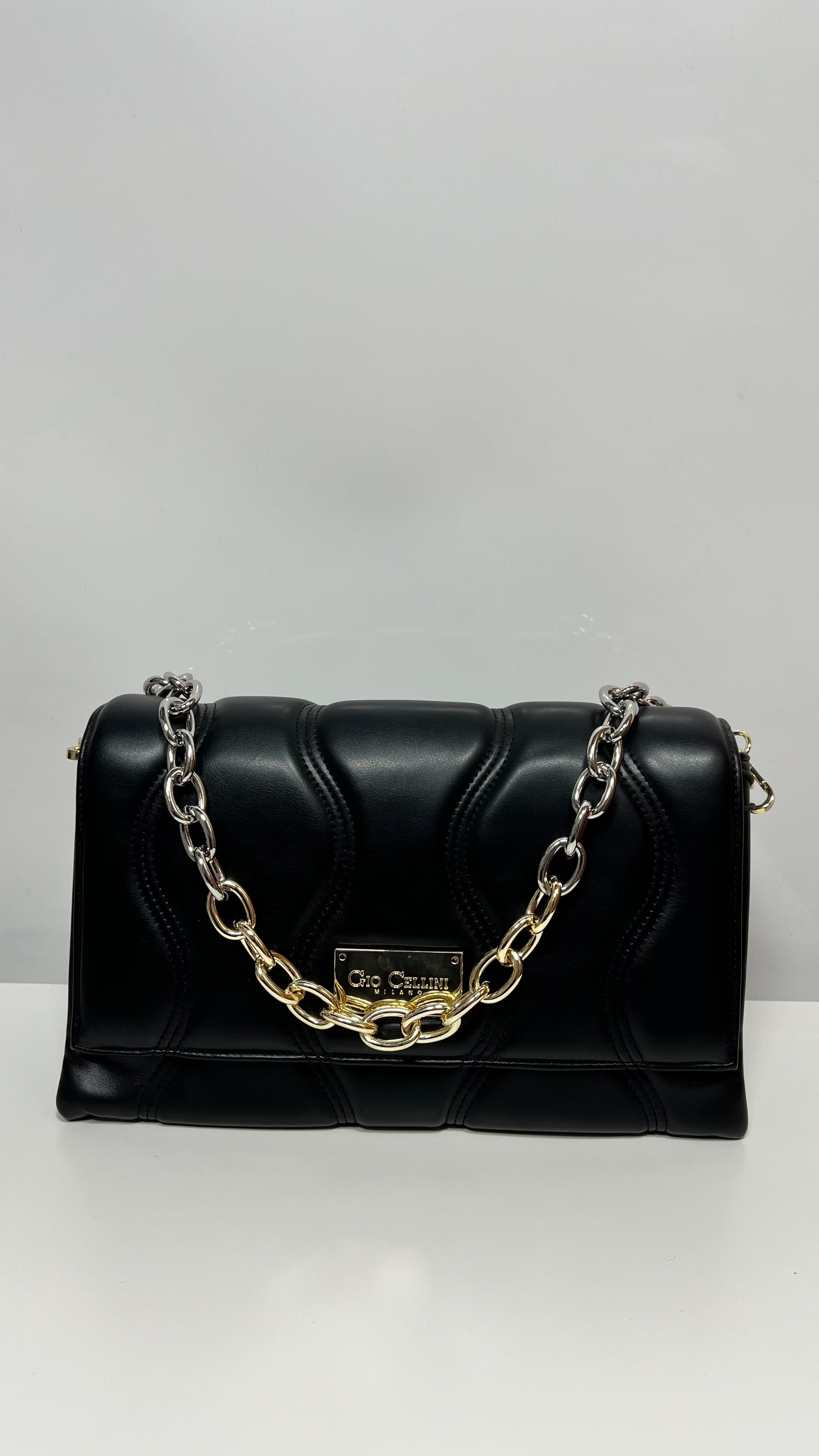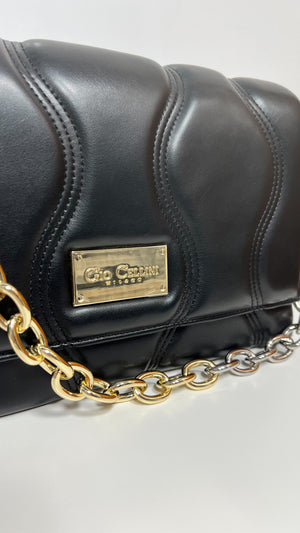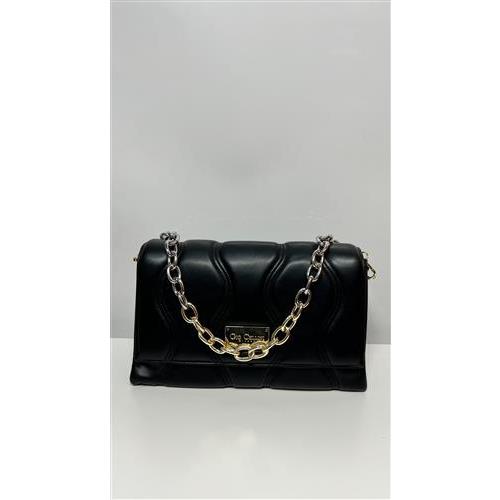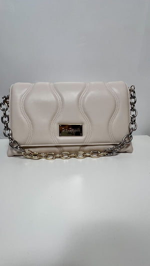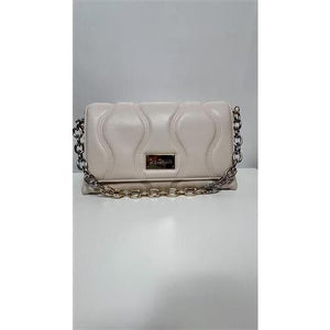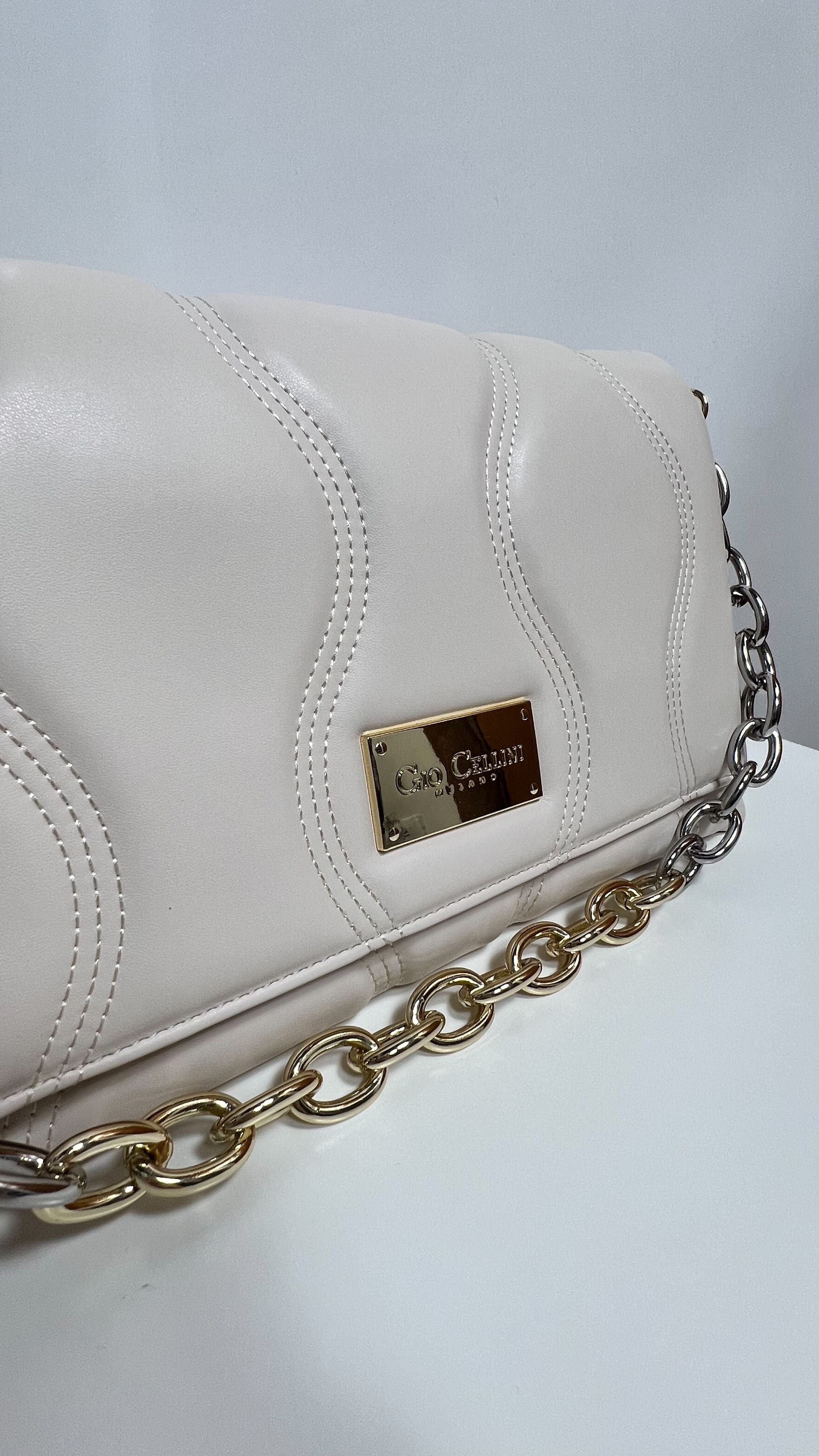 Borsa GIO CELLINI bianca a tre scomparti in ecopelle liscia con lavorazione con effetto trapuntato è chiusura con automatico. Tracolla a catena bicolor è logo placca finitura dorata.