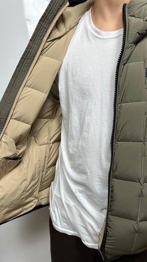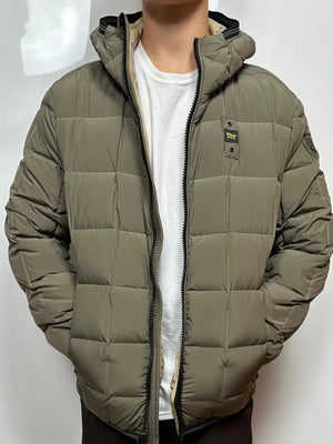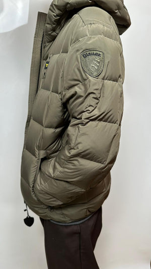 Giubbino BLAUER verde con imbottitura naturale in piuma, calda e non ingombrante. Cappuccio fisso con coulisse è realizzato in nylon lucido idrorepellente.