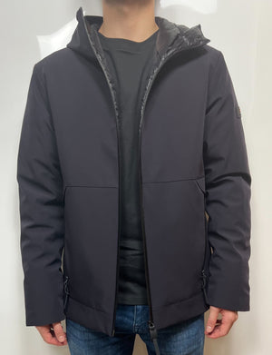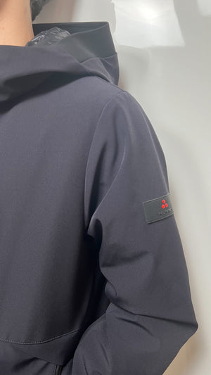 Giubbotto PEUTEREY blu in nylon elasticizzato accoppiato a un jersey di nylon soffice e caldo, con imbottitura in Primaloft. Full zip centrale nera spalmata, con doppio cursore, collo in piedi con profilo nero, tasche laterali e polsini antivento.