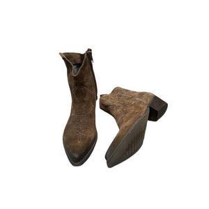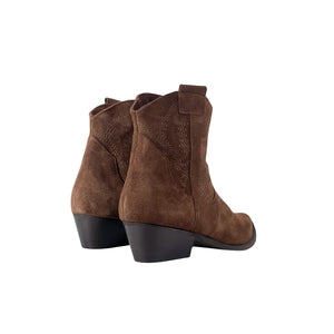 Texano in camoscio con punta sfilata e zip laterale. Il gambale è impreziosito da ricami, mentre l’interno combina pelle e tessuto per un comfort ottimale. Completa il design il tacco tagliato da 5 cm e la suola in gomma.