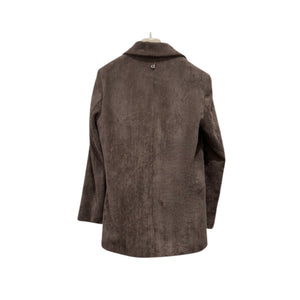 Questo blazer doppiopetto presenta una silhouette che valorizza le forme con gusto femminile grazie alla linea dritta e ai dettagli curati. Le tasche frontali aggiungono praticità perfetta da mattina a sera. L'effetto velluto a coste regala un tocco originale che illumina ogni look quotidiano con carattere.