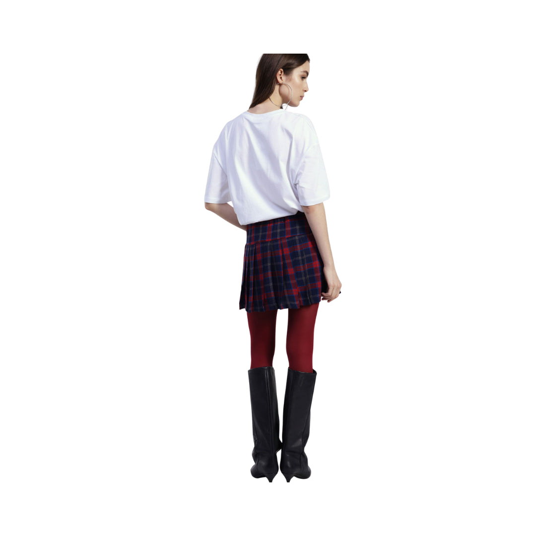 Questa gonna corta a pieghe con fantasia scozzese e vita alta è un vero tocco d’originalità per i tuoi look di tutti i giorni. L’elastico in vita assicura praticità e comodità, perfetta da indossare con blazer oversize o maglioni morbidi. Dettaglio dalle linee femminili che si fa notare con ogni passo.