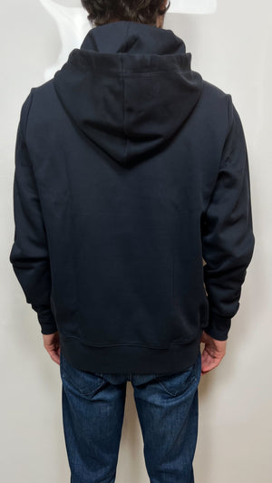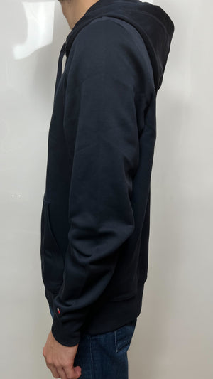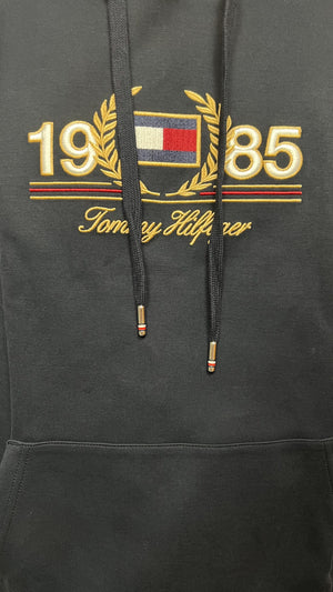Felpa blu TOMMY HILFIGER con stampa in colore oro, presenta un cappuccio regolabile con lacci e tasche a marsupio. 100% cotone.