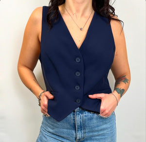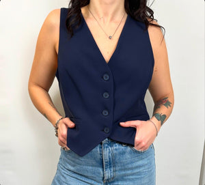 Gilet corto con bottoni frontali e scollo a V. Finte tasche a filetto sulla parte frontale