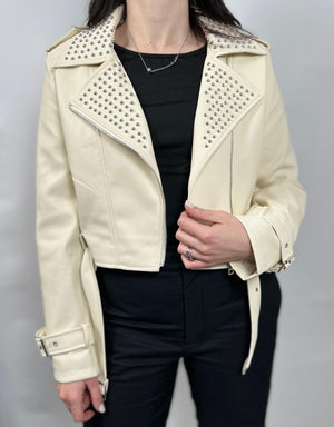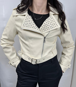 Giacca donna in similpelle firmata Gio Cellini modello dal taglio corto con cintura, borchie sul collo e chiusura con zip laterale.