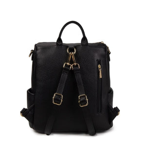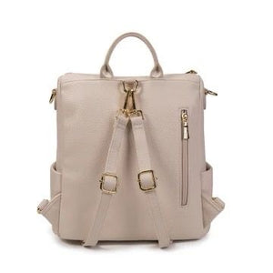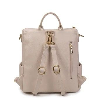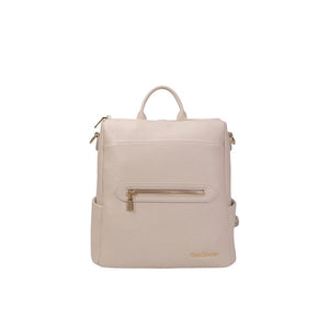 Zaino in ecopelle martellata, chiusura con cerniera, manico fisso, tre tasche interne di cui una con zip , due tasche laterali, tasca anteriore con zip, tasca posteriore con chiusura zip, logo lettering finitura dorata.