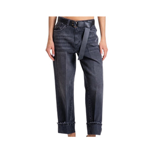 Jeans con risvolto sul fondo che aggiunge un tocco casual e contemporaneo. Dotato di cintura coordinata per valorizzare il punto vita, è realizzato con il classico design a 5 tasche e chiusura con zip e bottone.
