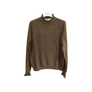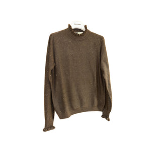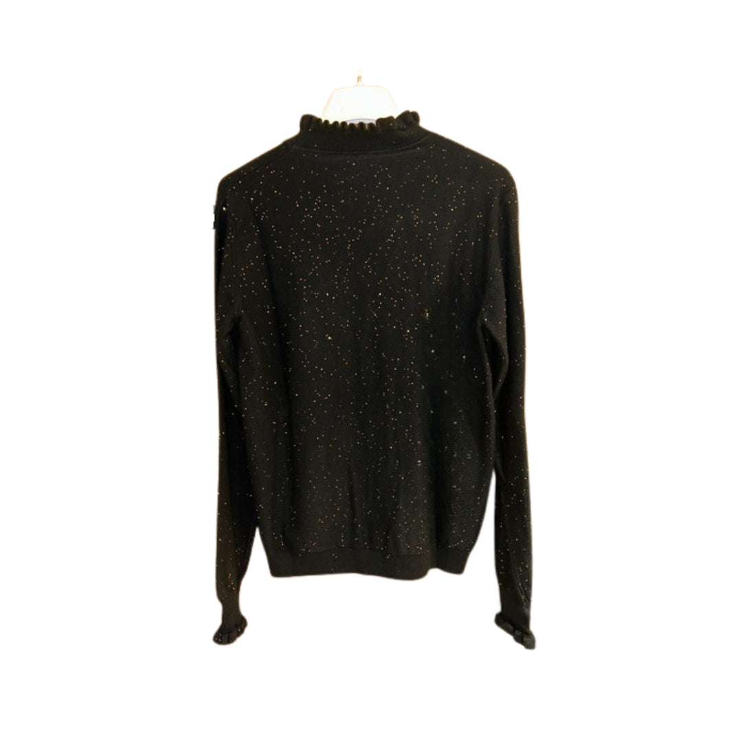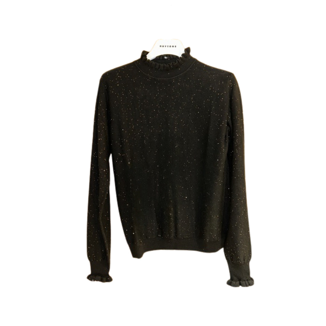 Un mix perfetto di eleganza e raffinatezza: questa maglia in viscosa firmata HaveOne è pensata per chi ama distinguersi con stile. Il colletto classico viene valorizzato da romantici dettagli di rouches, che ritroviamo anche sui polsini delle maniche lunghe per un tocco delicato e femminile. La lavorazione a costine dona struttura al capo, mentre le micro paillettes all over aggiungono una luce discreta ma d’impatto, ideale per outfit da giorno o da sera. Un capo versatile, perfetto da abbinare a pantaloni eleganti o gonne per un look chic e contemporaneo.