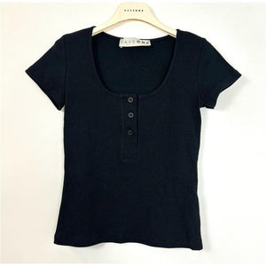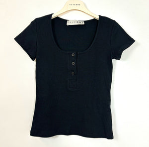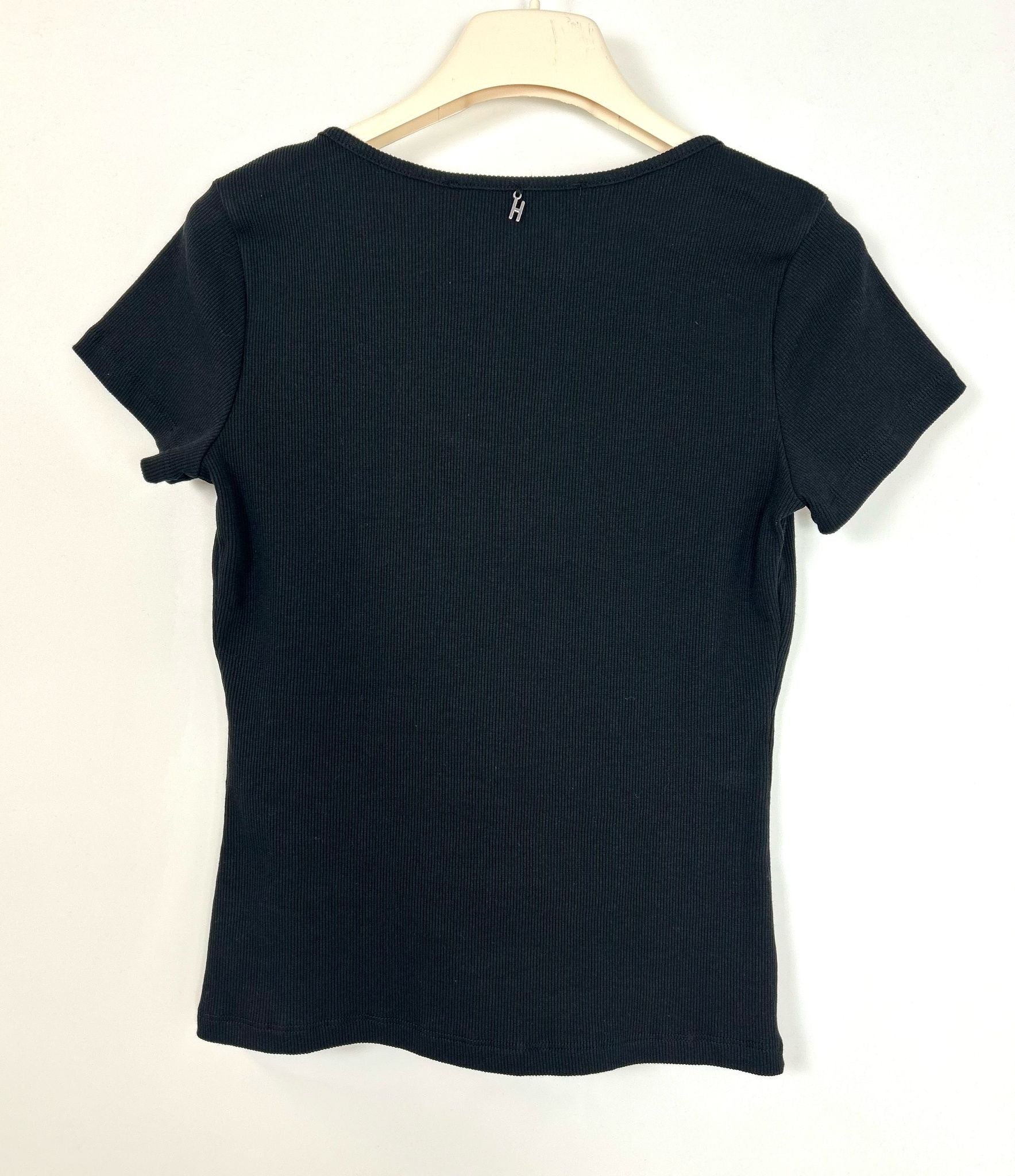 T-shirt color nero in cotone a costine, modello con scollo rotondo profondo e mezze maniche. Vestibilità corta, aderente ed elasticizzata.