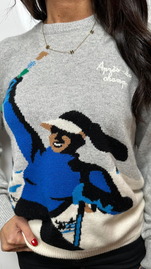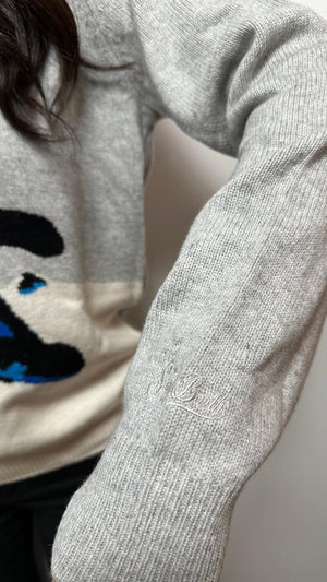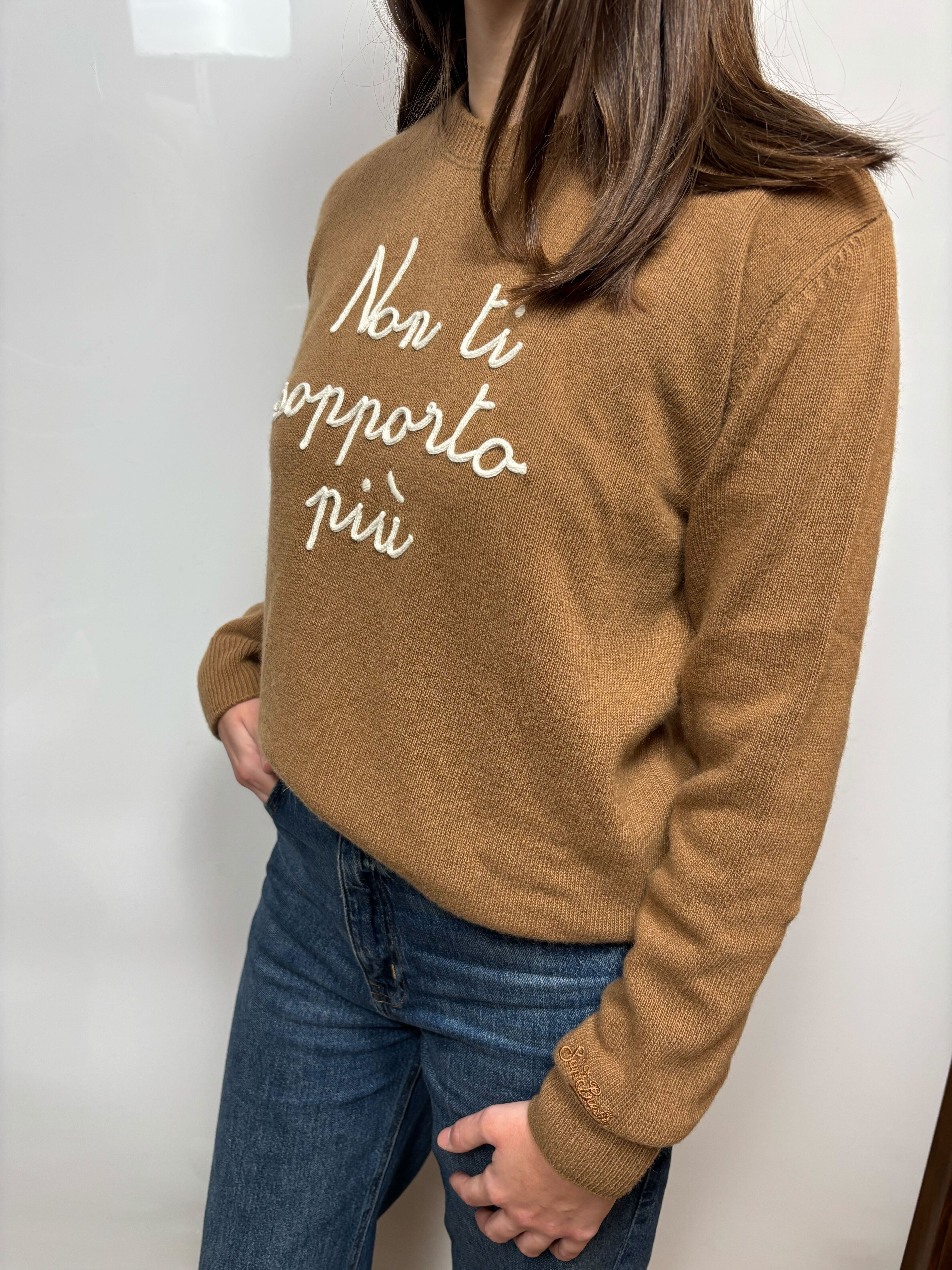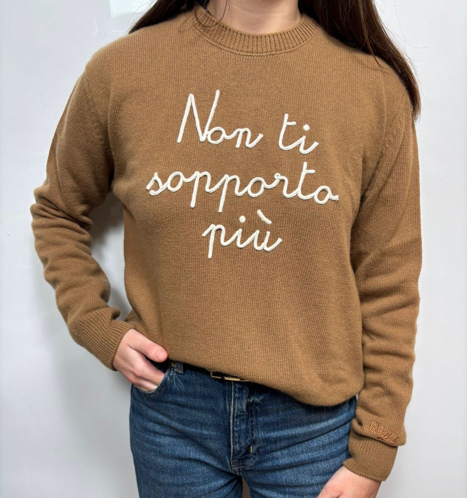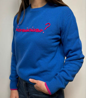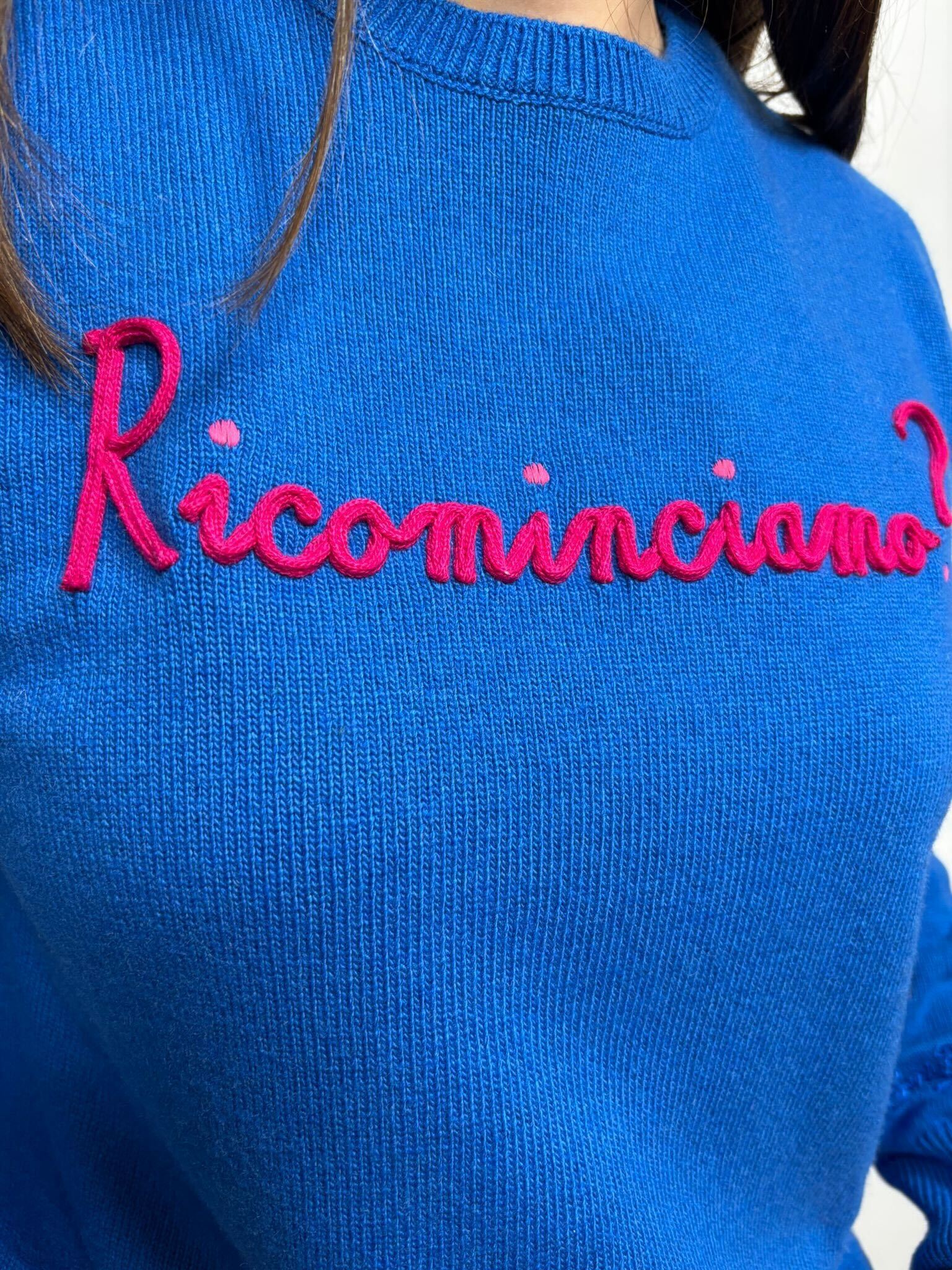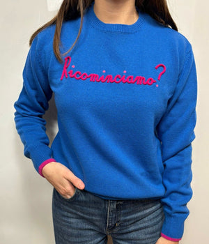 La maglia a girocollo di MC2 Saint Barth presenta collo,maniche e polsi a costine e dettagli logo azienda sul polso della manica sinistra e ricamo in contrasto sul fronte con scritta ''RICOMINCIAMO?''. La maglia calda e corposa dovuta dalla sua composizione:40% lana, 30% viscosa, 20% poliamide e 10% cashmere.