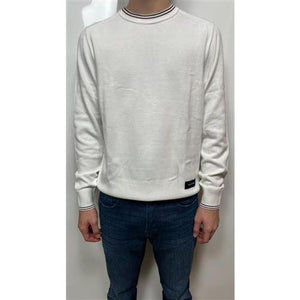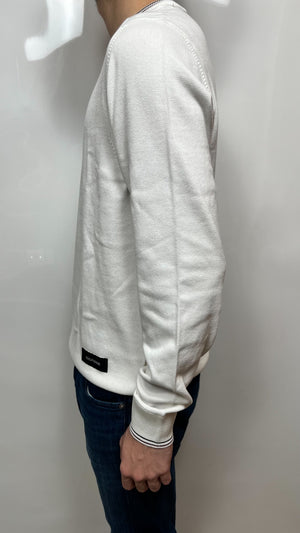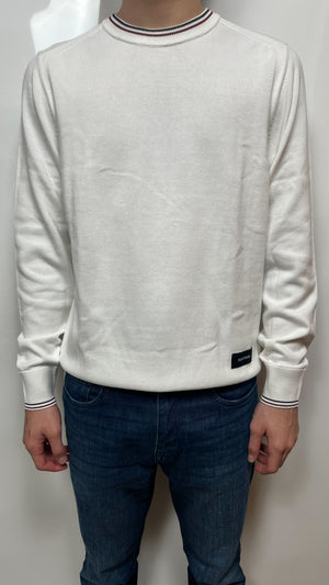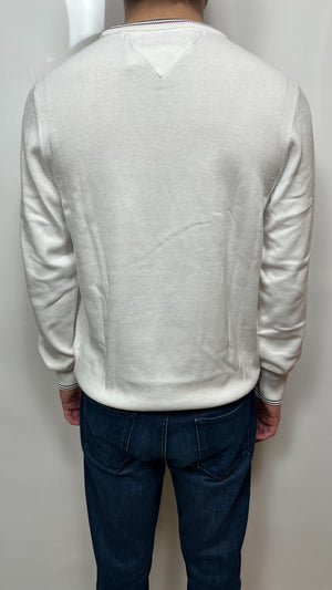 Pullover bianco TOMMY HILFIGER a girocollo con colori distintivi del marchio a contrasto su collo e polsini con marchio applicata sulla parte bassa frontale. 100% cotone.
