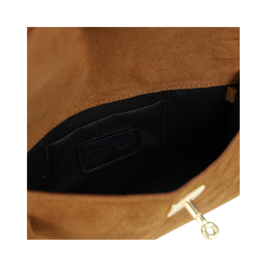 L’interno è organizzato in un unico compartimento, perfetto per contenere portafoglio, smartphone e piccoli oggetti personali. La tracolla regolabile e rimovibile permette di indossarla a tracolla o a spalla, offrendo versatilità e comfort.