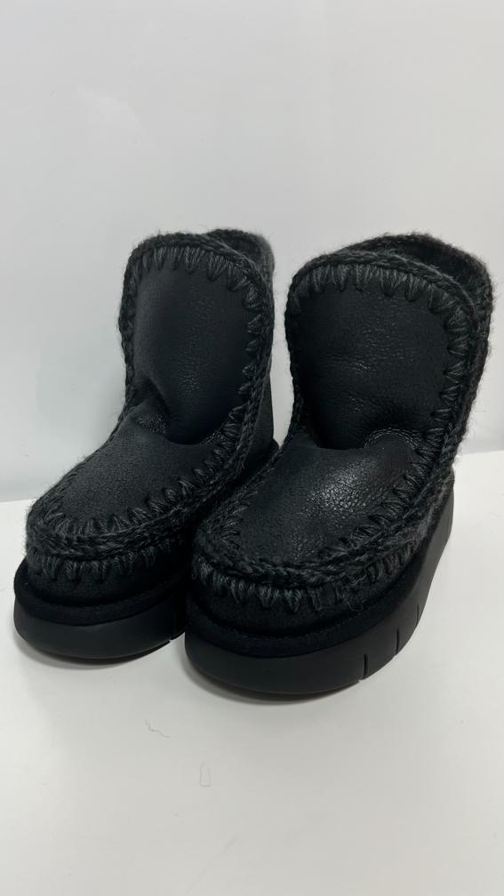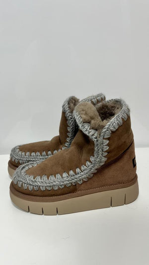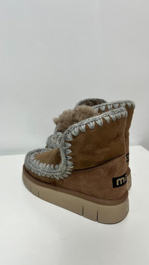 Eskimo MOU cammello a contrasto grigio. Sapientemente realizzato a mano in vera e lussuosa pelle di montone, questo stivaletto è incredibilmente comodo e resistente grazie alla suola in EVA. Altezza 22 cm.