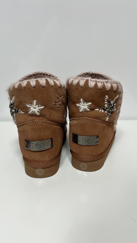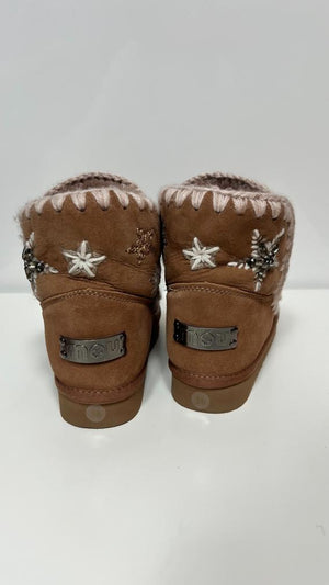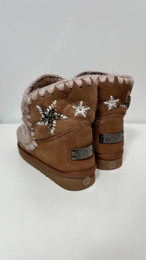 Eskimo platform boot è sapientemente realizzato a mano in lussuoso camoscio e presenta Stelle ricamate con preziosi e le cuciture in lana all'uncinetto distintive di mou. Incredibilmente confortevole e resistente con suola in gomma EVA. Altezza 18 cm.