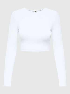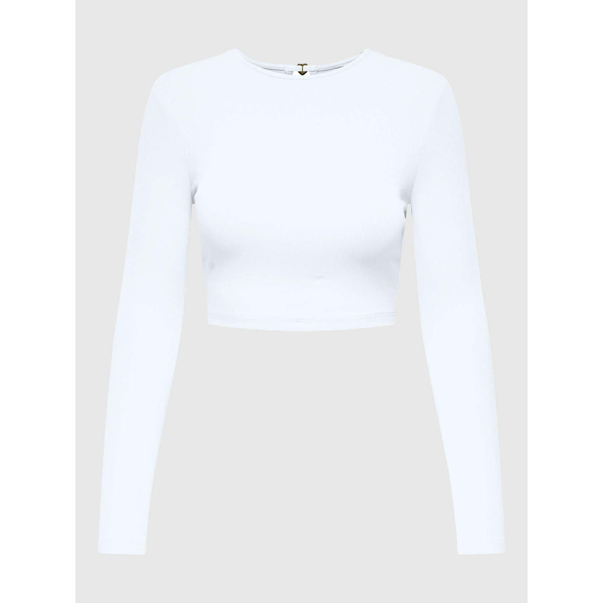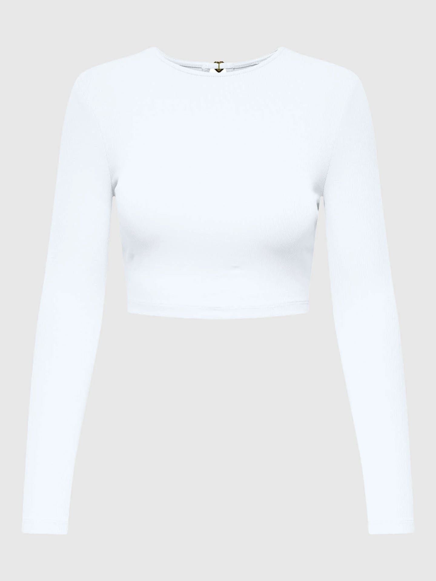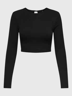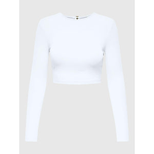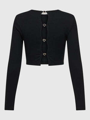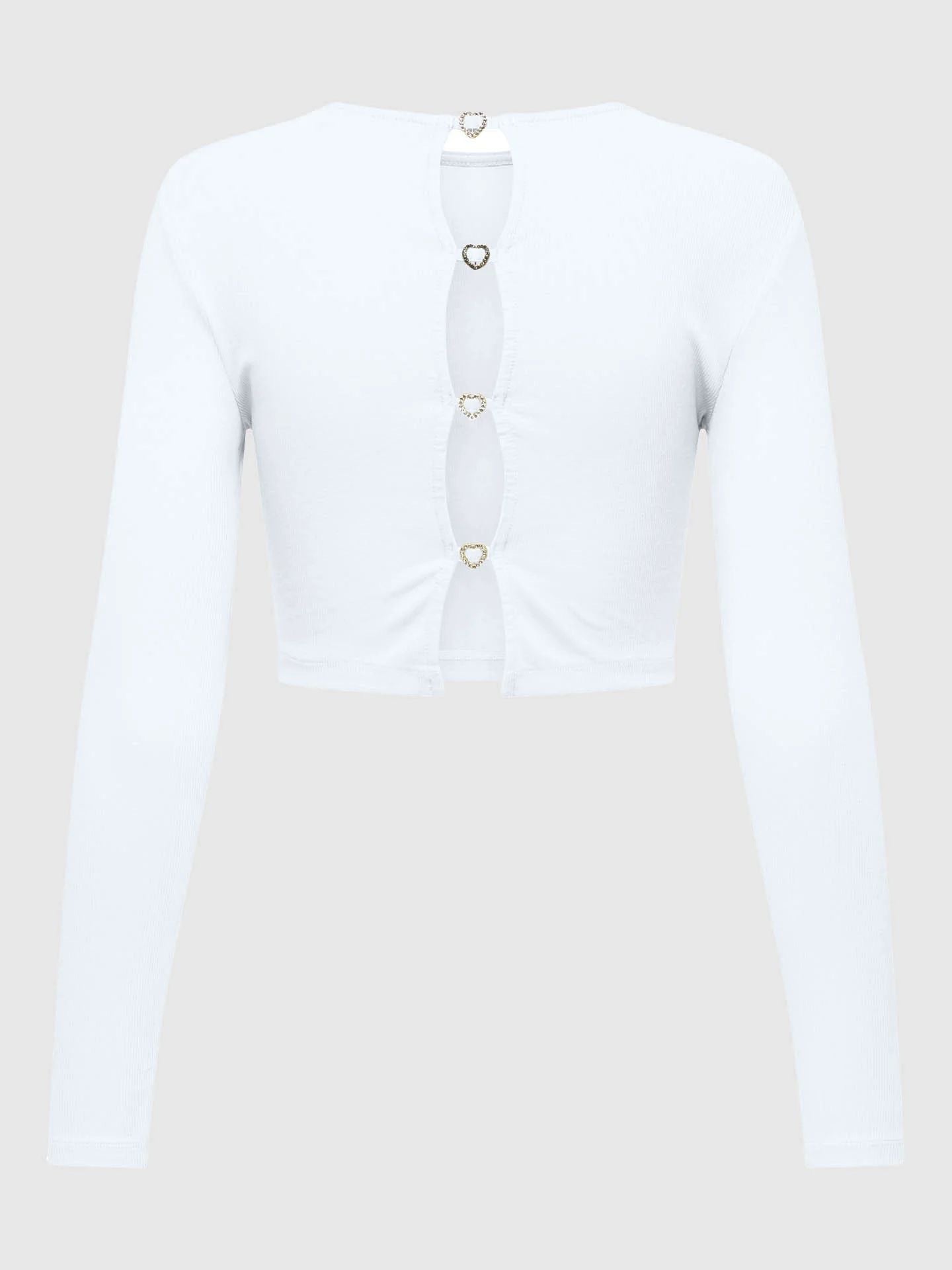 Maglia a maniche lunghe a girocollo, con piccola apertura sul retro con dettagli cuoricini strassati.