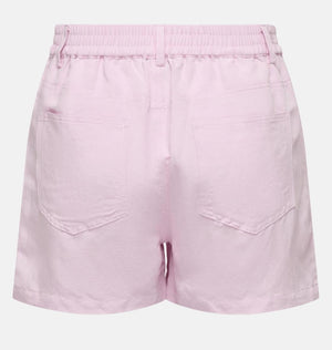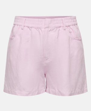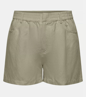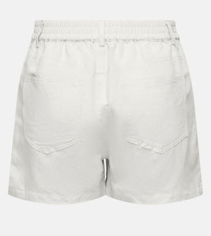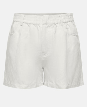 Shorts vita media, chiusura con bottone e zip, tasche frontali e tasche posteriori, passanti per cintura, vita elasticizzata.