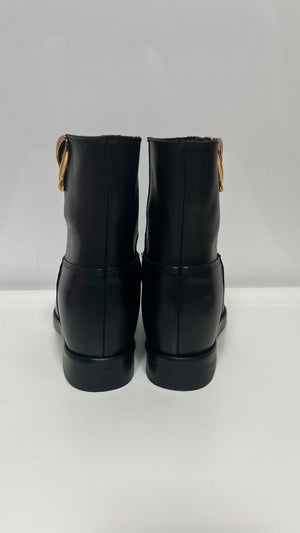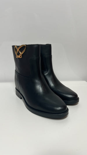 Scarpa OVYE' nera in pelle, accessorio platino, zeppa interna di 3 cm.