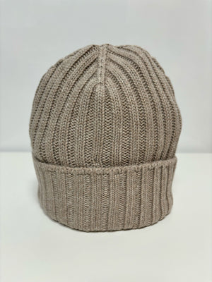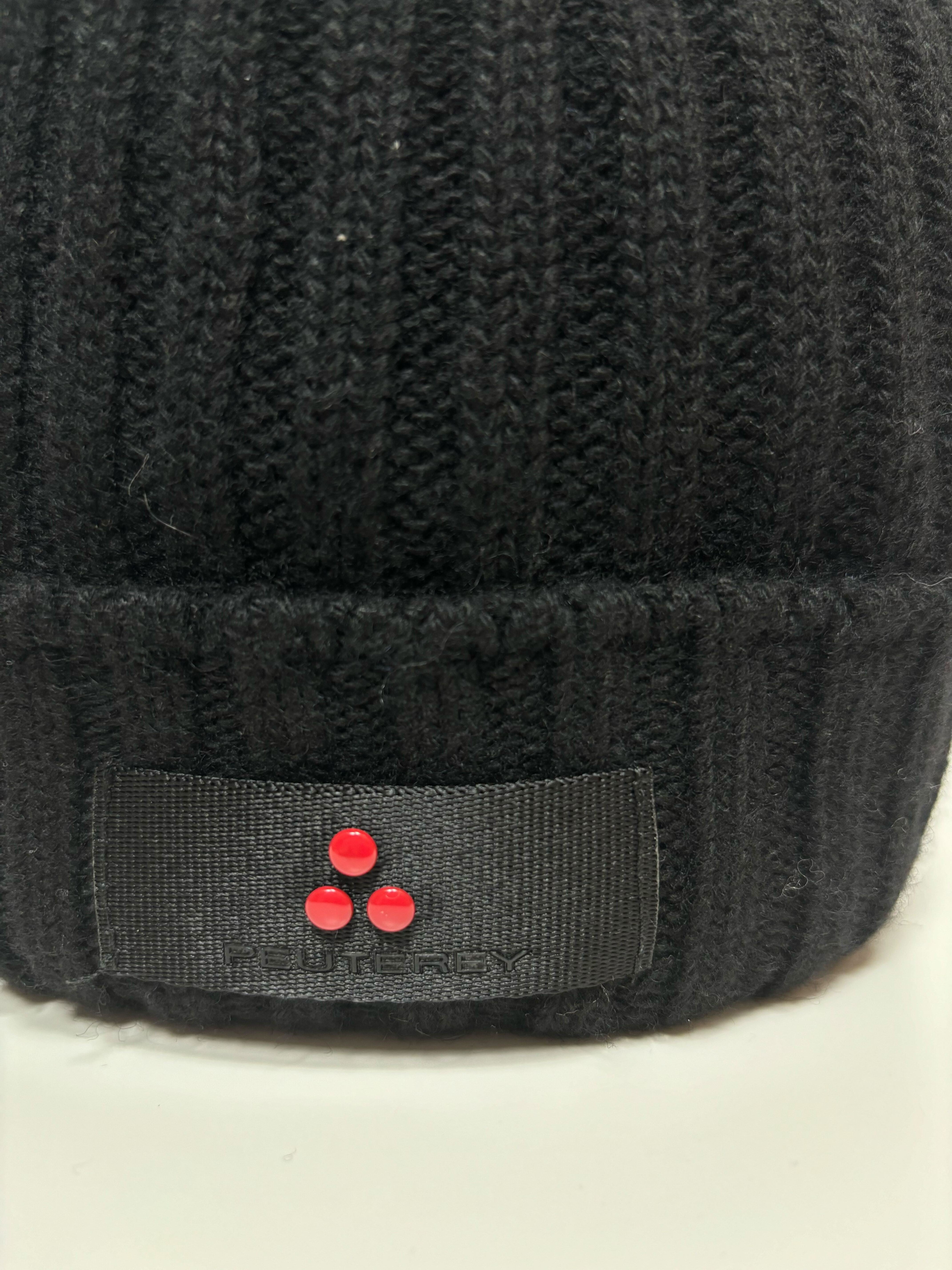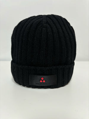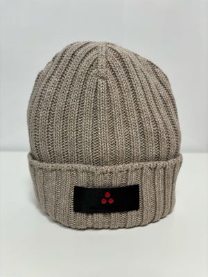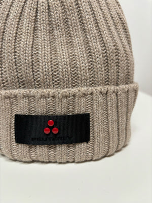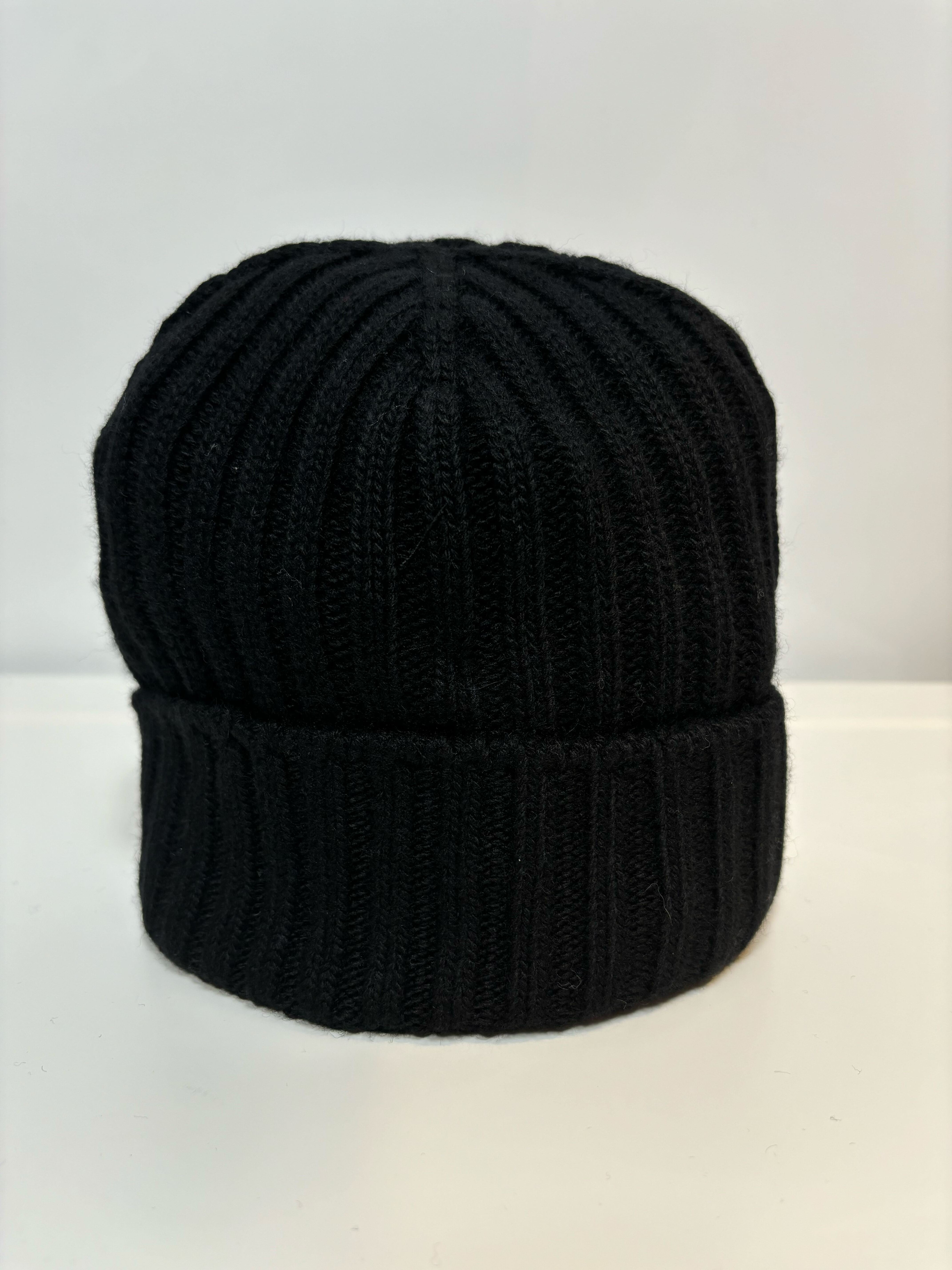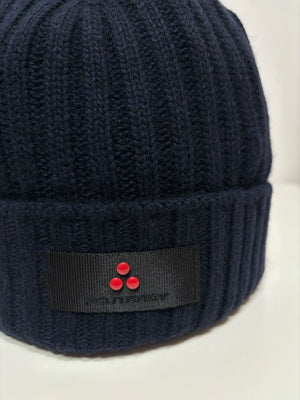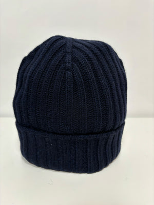 Caldo cappello in misto cachemire distinto da una personalizzazione con logo sulla parte anteriore. Lavorazione a coste con risvolto. Caldo e comodo, perfetto per accompagnarti nelle giornate più fredde. Color blu.