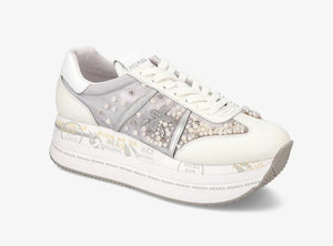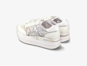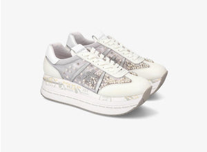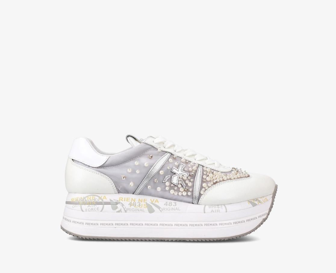 Sneakers Beth con tomaia realizzata in tessuto, impreziosita da perline sviluppate in dissolvenza sulla scarpa. Fondo platform colorato e personalizzato dalla serigrafia logata Premiata.