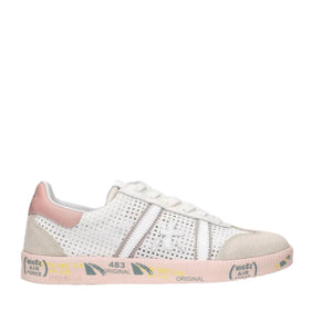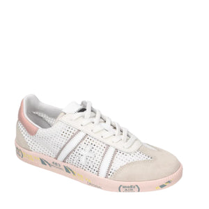 Sneaker BONNIED realizzata in tessuto traforato bianco e camoscio grigio con inserto al tallone in pelle rosa. Dettaglio logo in pelle a lato. Suola in gomma rosa altezza 2,5 cm con le iconiche stampe graffiti.