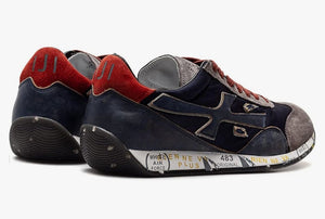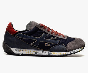 Sneaker Premiata con tomaia in tessuto tecnico, nabuk e suede, fondo in gomma con scritte, interno in pelle, plantare rimovibile, lacci in tessuto, occhielli traforati.