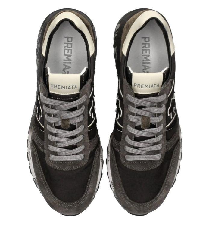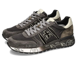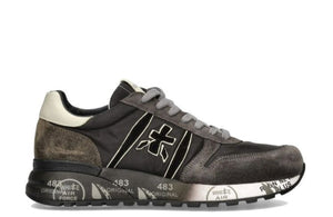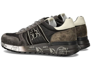 Sneakers Premiata da uomo modello Lander Var 4951 in camoscio grigio e nylon nero. Dettaglio marrone nel retro. Allacciatura a sette fori con lacci grigi piatti. Punta stondata e cuciture a vista. Logo nei laterali in camoscio e nella linguetta in rilievo. Interno in pelle e soletta estraibile. Suola esterna in gomma nera e bianca con dettagli di stampe a contrasto, 483 simbolo per l’azienda, di buon auspicio