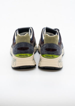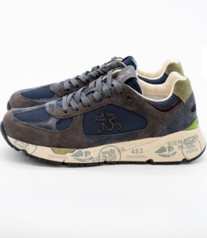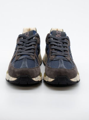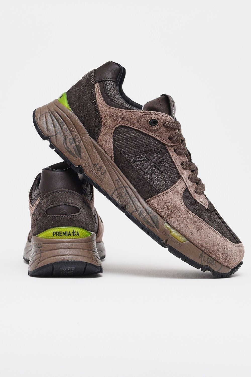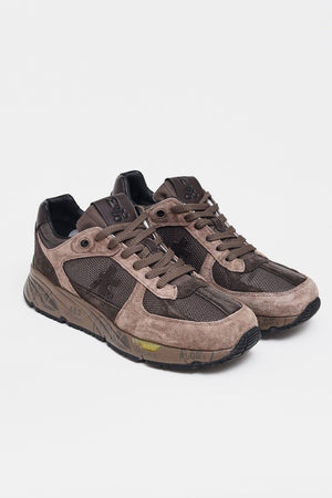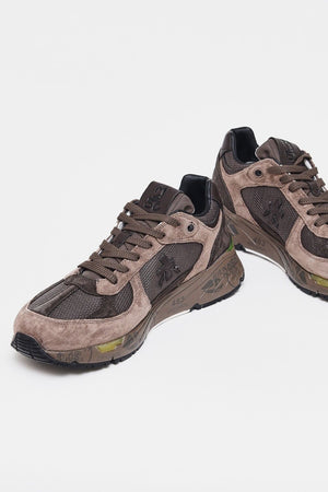 Sneakers in camoscio tortora, tessuto a trama lavorata, logo laterale a contrasto