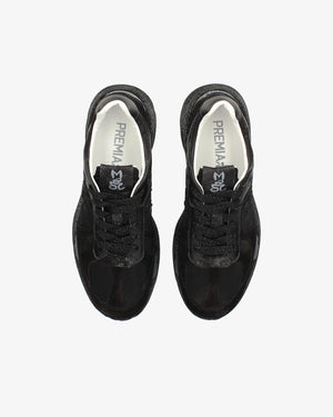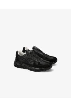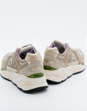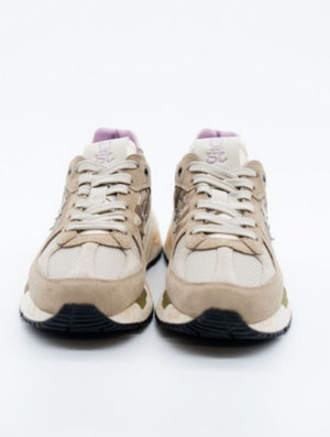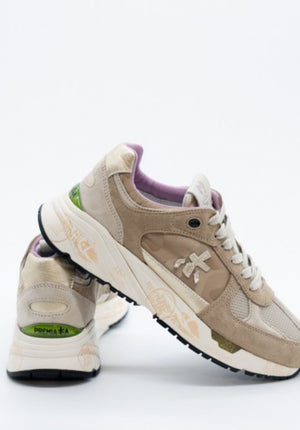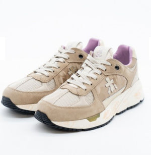 Premiata realizzata con un mix di materiali: pelle scamosciata dai colori neutri, inserti in tessuto di colore beige e pelle dorata. La punta è caratterizzata dall'utilizzo di materiale tecnico intrecciato, il talloncino è in pelle dorata. La linguetta in nylon è impreziosita dal label in pelle Mase stilizzato a contrasto di colore. Tutti questi dettagli e inserti a contrasto rappresentano in particolar modo questo modello. La suola ergonomica e super leggera riporta il lettering iconico di Premiata.