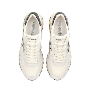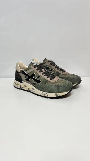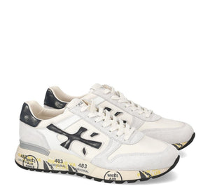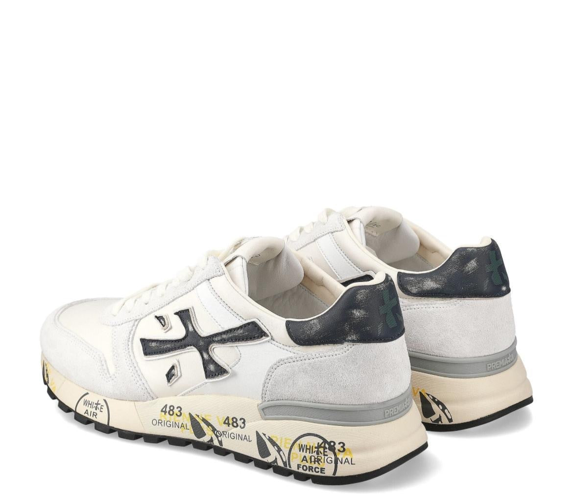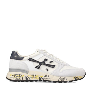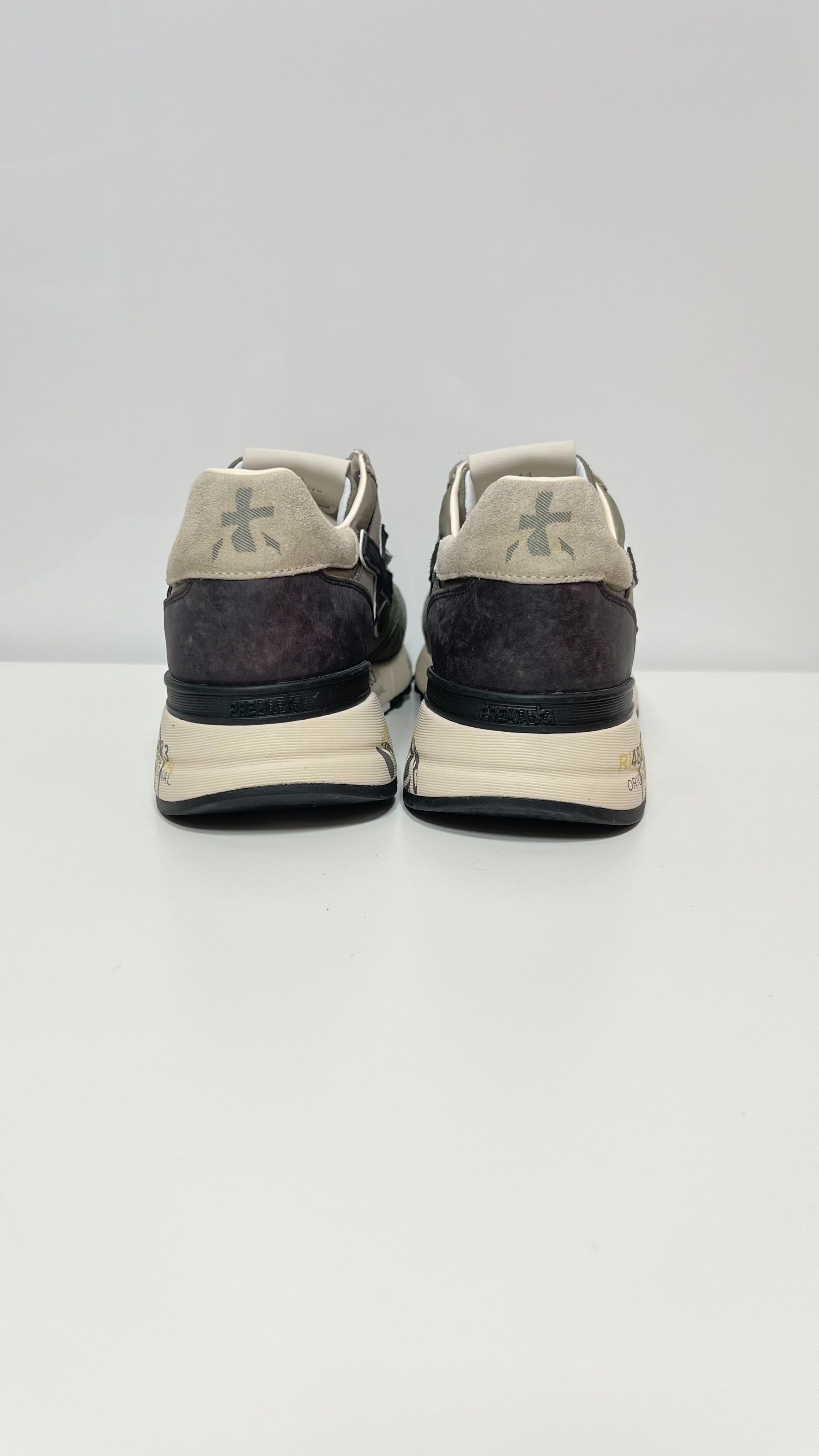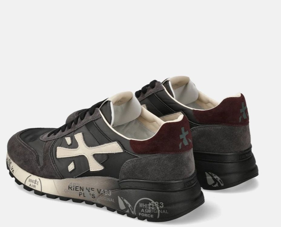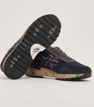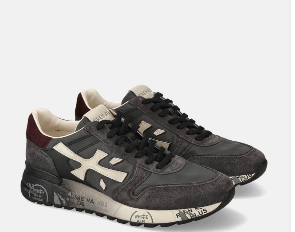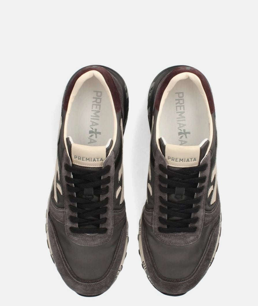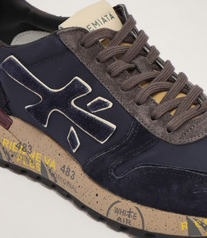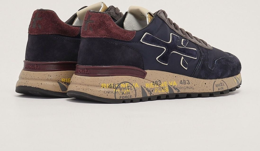 Sneakers in camoscio e nylon blu e grigio, tallone bordeaux a contrasto,maxi logo laterale.