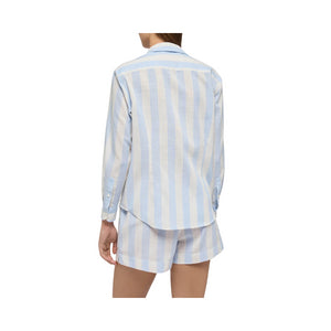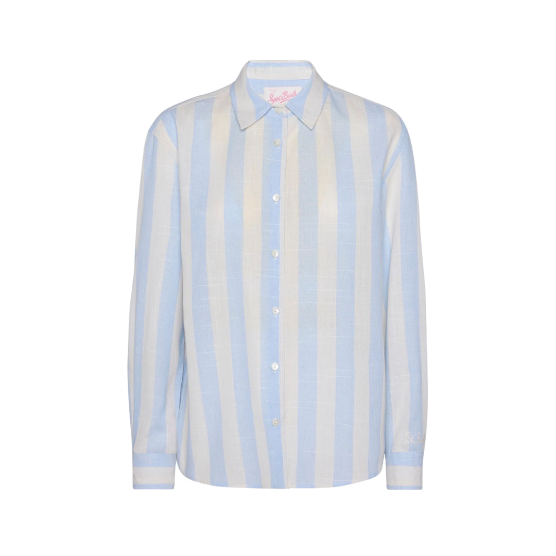 Camicia Meredith con colletto a punta con bottoni, abbottonatura con bottoni in madreperla, maniche lunghe con polsini abbottonati, spalle basse, carré posteriore con pieghe sull’abbottonatura, stampa a righe azzurro chiaro all-over, ricamo esclusivo Saint Barth sulla manica