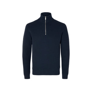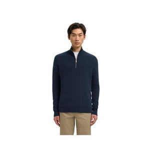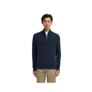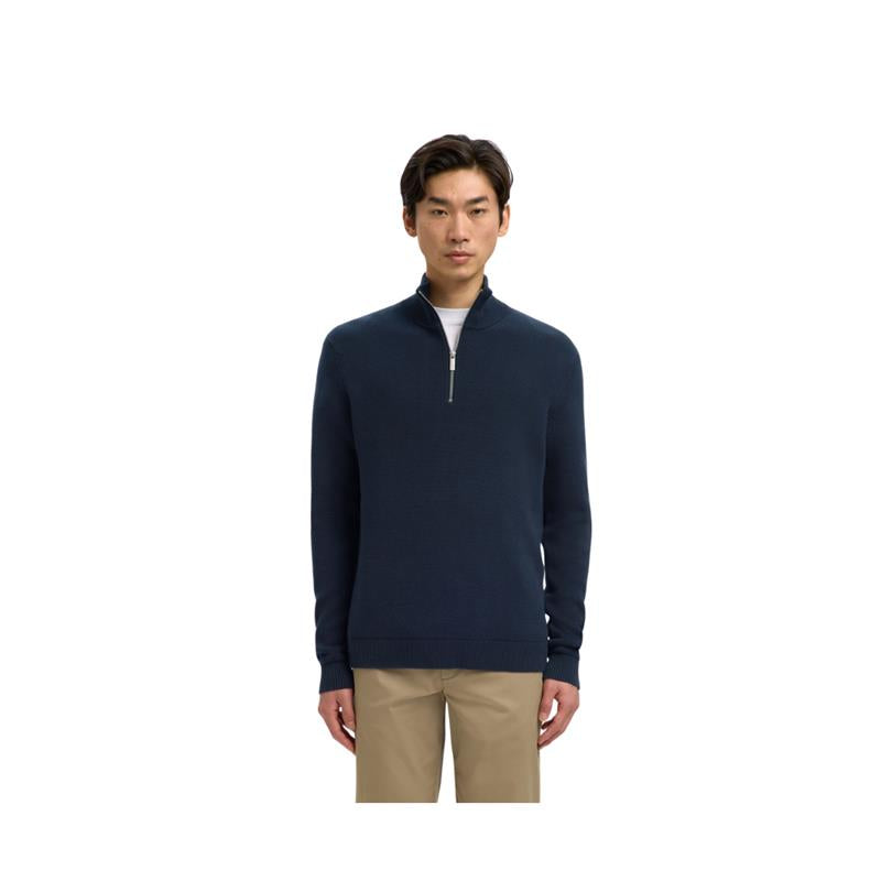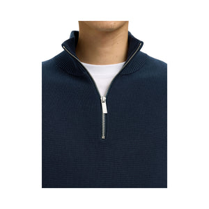 Questa maglia da uomo presenta un design pulito e versatile, perfetto per diverse occasioni. Realizzata in un morbido tessuto blu navy, si distingue per il collo alto con chiusura a mezza zip in metallo, che aggiunge un tocco contemporaneo e funzionale. Il tessuto ha una lavorazione fine e compatta, piacevole al tatto e adatta sia alle stagioni più fresche che a quelle intermedie. I bordi a costine su polsini e fondo garantiscono una vestibilità comoda e curata. Facile da abbinare con jeans o pantaloni chino, questa maglia è una scelta raffinata per chi ama lo stile sobrio e senza tempo.
