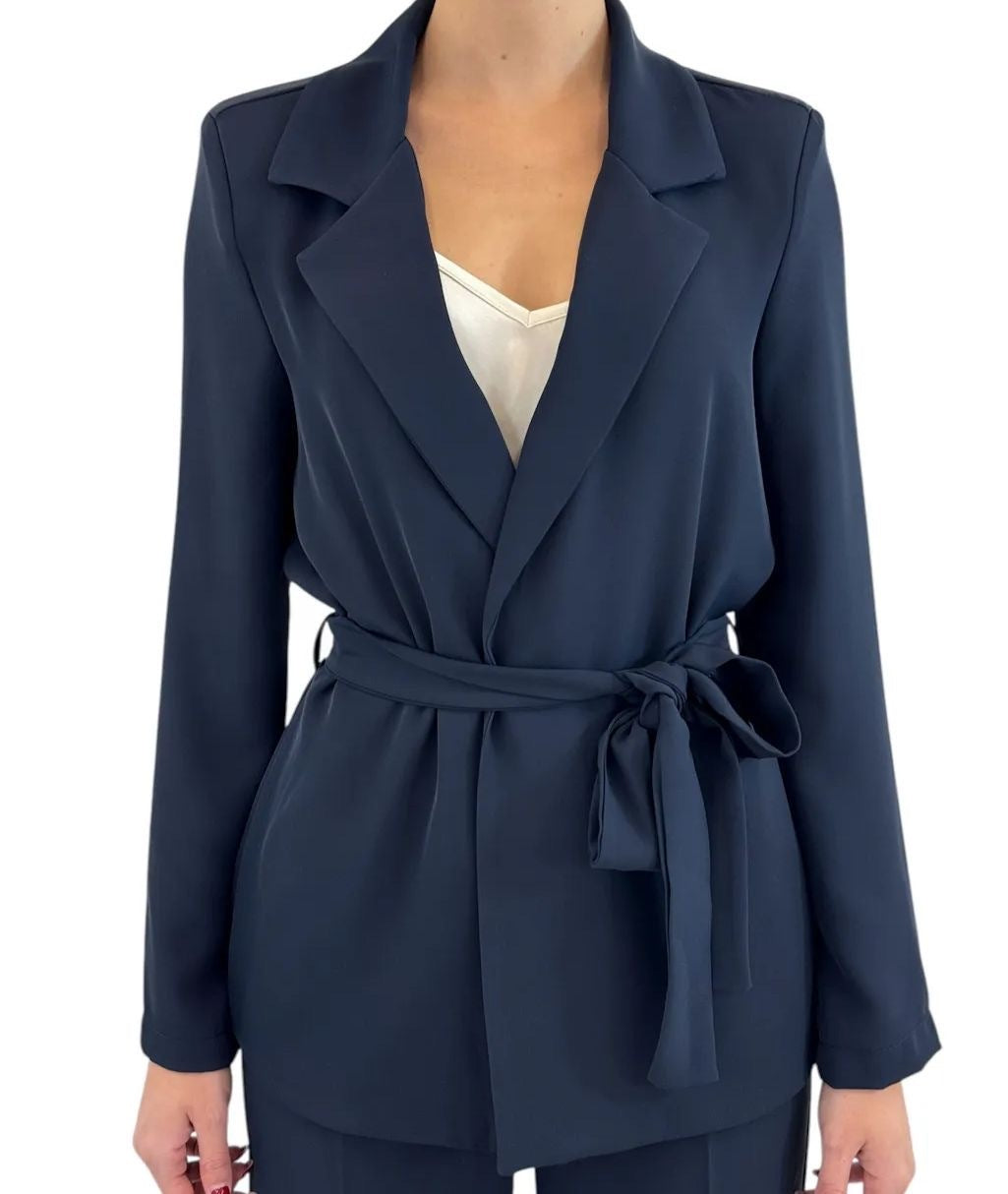 Completo Susy Mix Blu giacca con fiocco e con spallina imbottita e pantalone a palazzo.