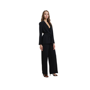 Completo composto da blazer senza tasche con passanti e fiocco in vita + pantaloni a gamba larga e tasche laterali.