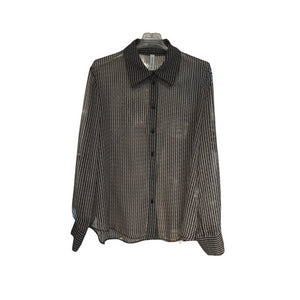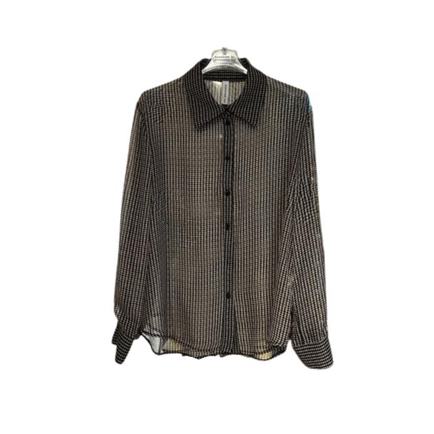 Questa camicia firmata Tensione In unisce eleganza e contemporaneità grazie al suo tessuto leggero e semi-trasparente, perfetto per creare giochi di sovrapposizioni. Il raffinato motivo pied de poule dona un tocco classico rivisitato in chiave moderna, mentre il colletto classico e la chiusura frontale con bottoni completano il design essenziale e femminile. Ideale per look sia casual chic che più sofisticati, può essere indossata con una canotta sotto per un effetto più discreto, oppure lasciata aperta come sovracamicia per un outfit di tendenza