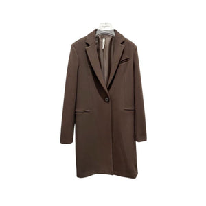 Questo cappotto da donna firmato Tensione In è un capo essenziale per un guardaroba raffinato e senza tempo. Dalla linea pulita ed elegante, presenta una silhouette dritta e leggermente strutturata che valorizza la figura senza costringerla. Il design minimalista è impreziosito dal classico rever a lancia e dalla chiusura a un solo bottone frontale, elementi che conferiscono un tocco di sobria eleganza.