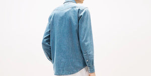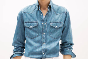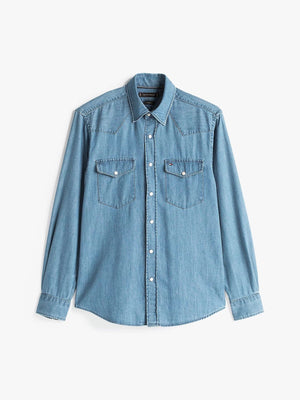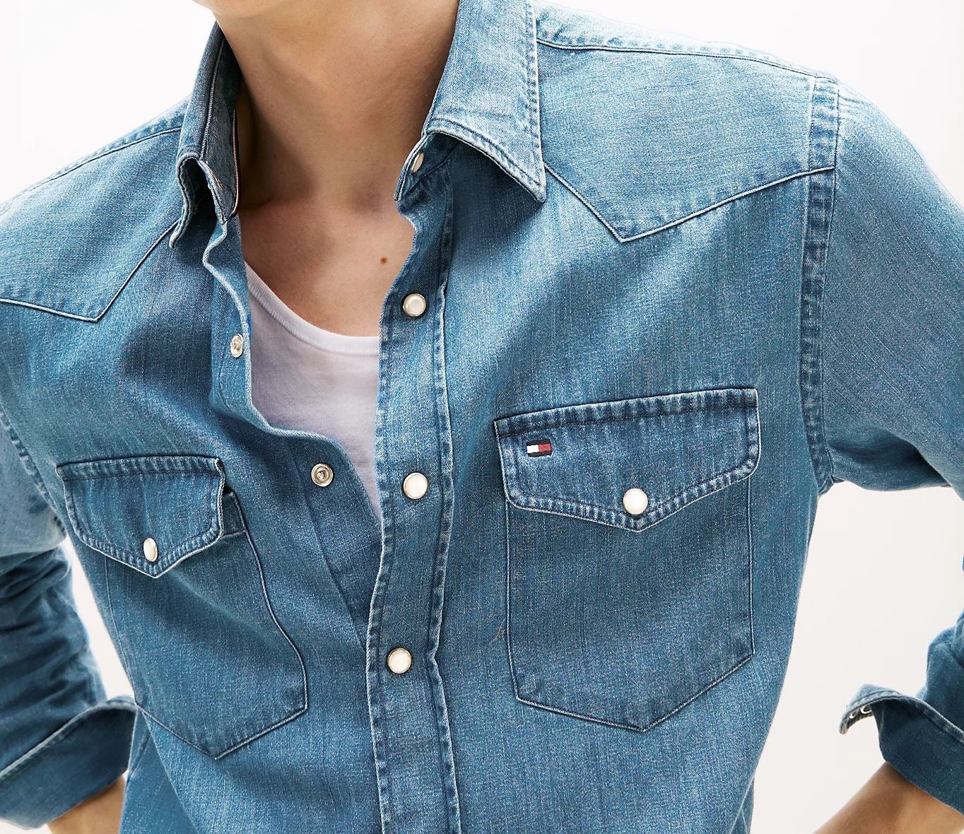 Camicia Denim stile western, leggera, chiusura con bottoni automatici, colletto button down, polsini arrotondati con bottone automatico, due tasche con bottone automatico sul petto,branding Tommy Hilfiger, bandierina Tommy Hilfiger ricamata sul petto